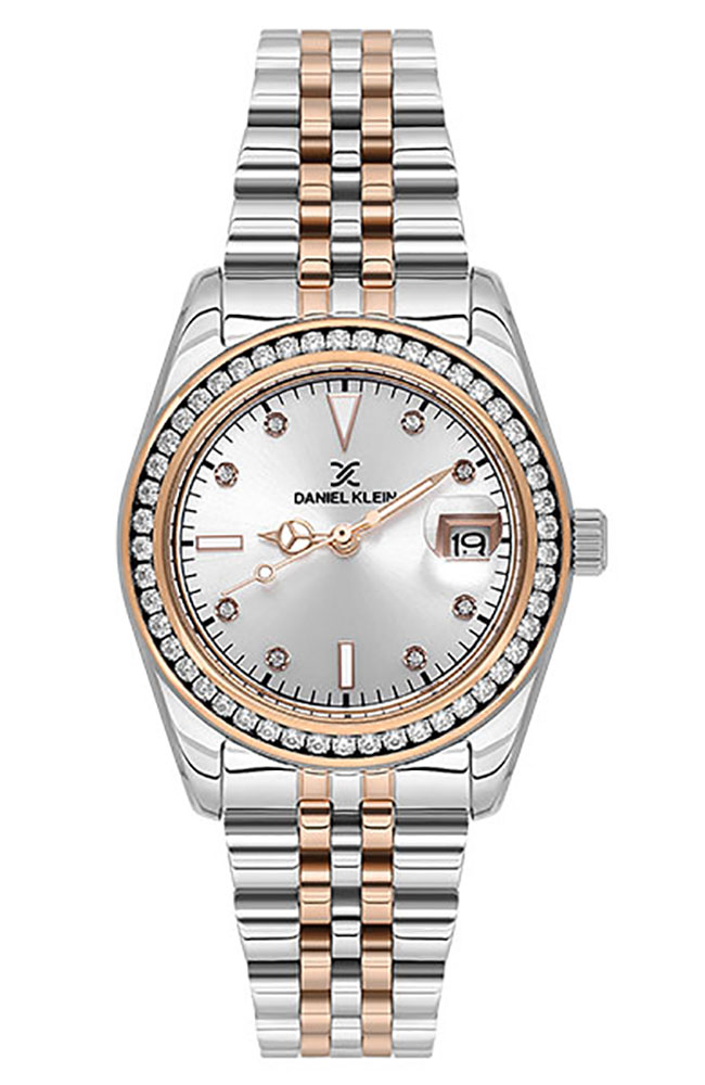 Γυναικείο ρολόι Daniel Klein με ασημί καντράν, πέτρες Ζιργκόν και δίχρωμο μπρασελέ.