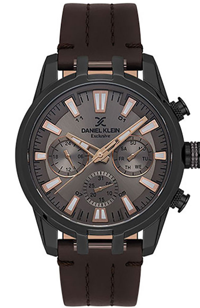 Ανδρικό ρολόι Daniel Klein με ανθρακί καντράν και καφέ δερμάτινο λουράκι.