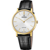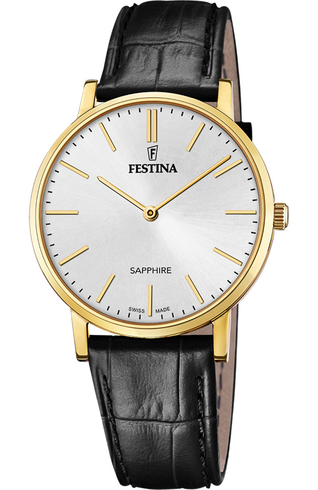 Ανδρικό ρολόι Festina από επιχρυσωμένο ανοξείδωτο ατσάλι με ασημί καντράν και μαύρο δερμάτινο λουράκι.