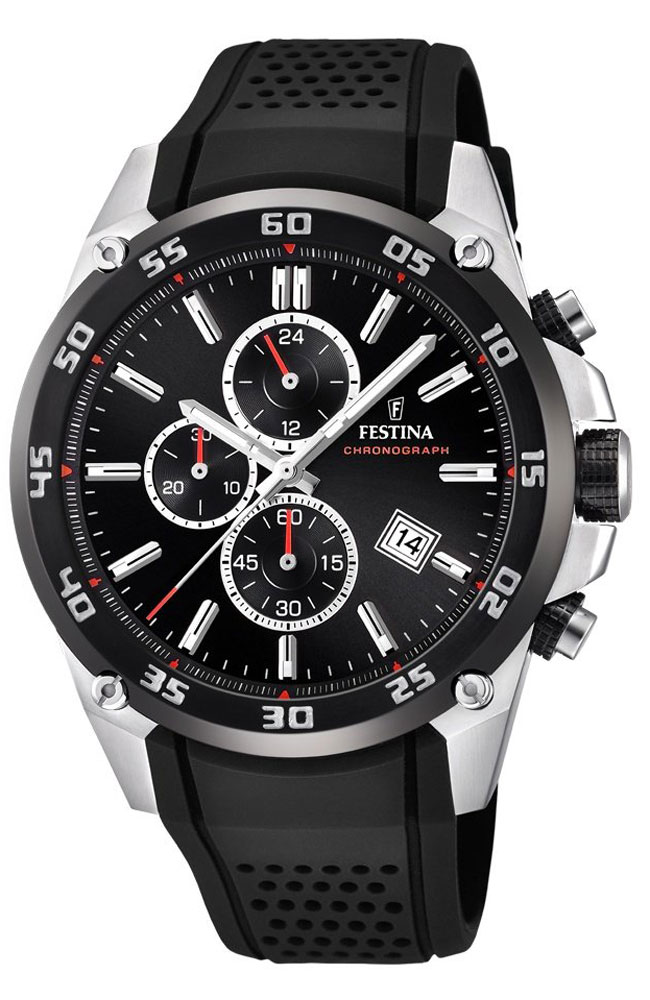 Ανδρικό ρολόι Χρονογράφος Festina από ανοξείδωτο ατσάλι με μαύρο καντράν και μαύρο καουτσούκ λουράκι.
