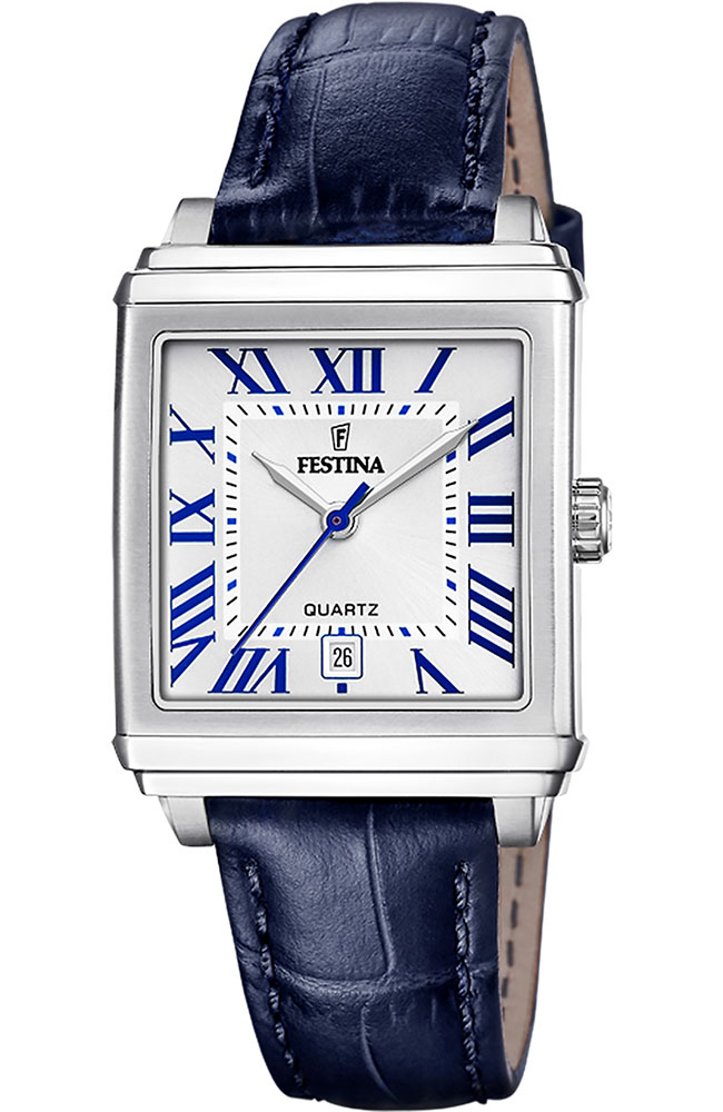 Γυναικείο ρολόι Festina από ανοξείδωτο ατσάλι με ασημί καντράν και μπλε δερμάτινο λουράκι.