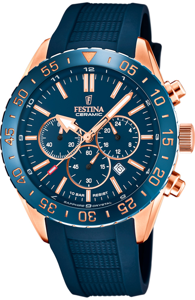 Ανδρικό ρολόι Χρονογράφος Festina από ανοξείδωτο ατσάλι με μπλε καντράν και καουτσούκ λουράκι.