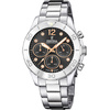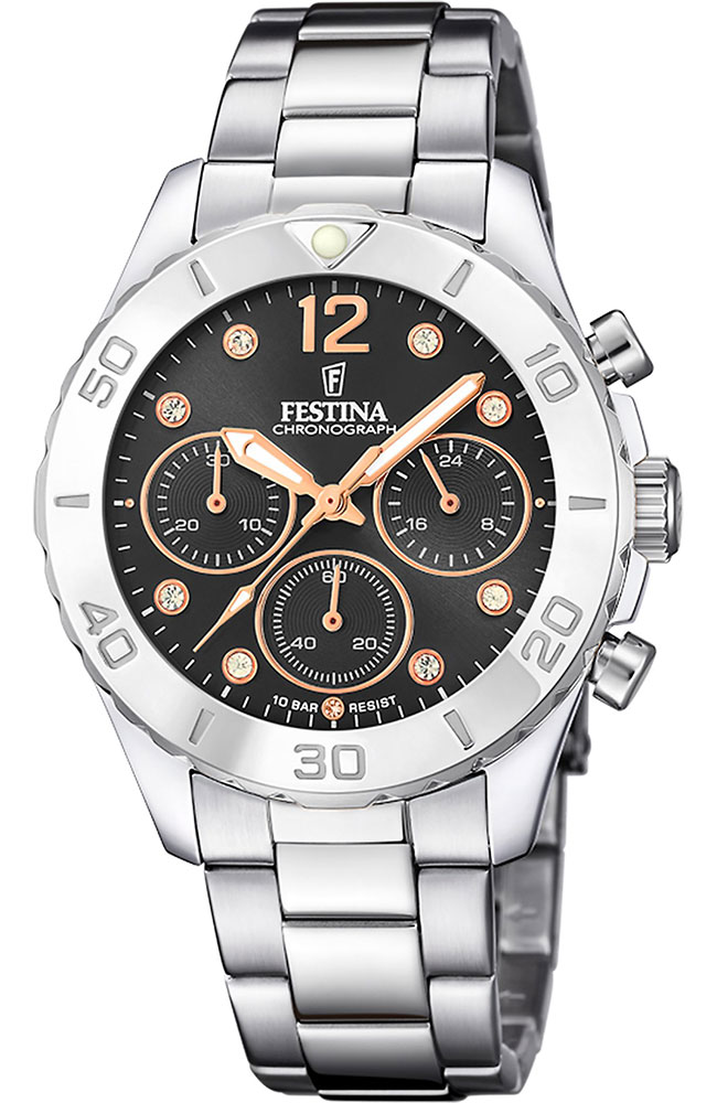 Γυναικείο ρολόι χρονογράφος Festina από ανοξείδωτο ατσάλι με μαύρο καντράν, πέτρες Ζιργκόν και ασημί μπρασελέ.