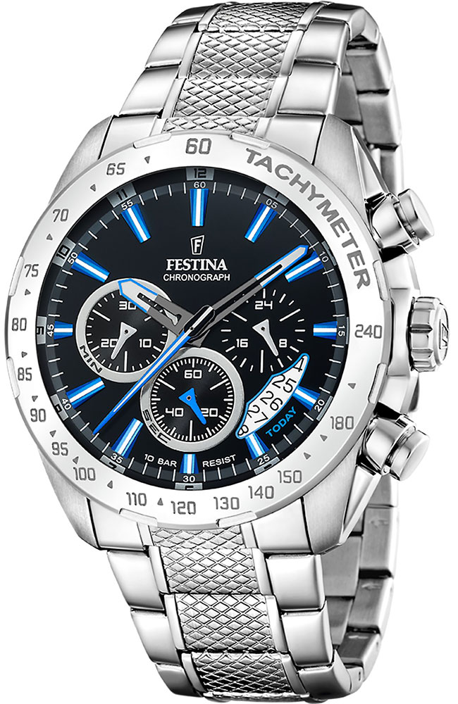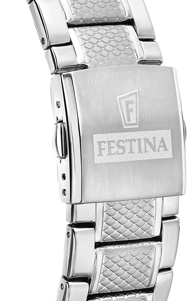 Ανδρικό ρολόι χρονογράφος Festina από ανοξείδωτο ατσάλι με μαύρο καντράν και ασημί μπρασελέ.