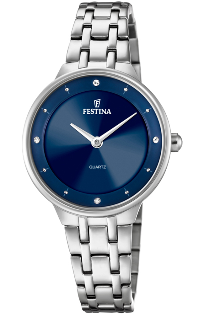 Γυναικείο ρολόι Festina από ανοξείδωτο ατσάλι με μπλε καντράν, πέτρες ζιργκόν και μπρασελέ.
