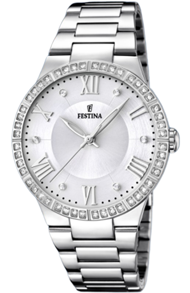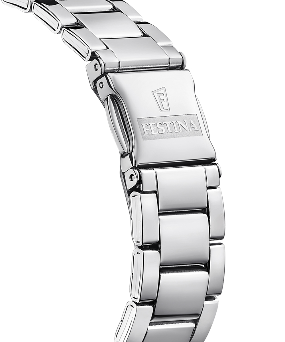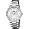 Γυναικείο ρολόι Festina από ανοξείδωτο ατσάλι με λευκό καντράν, πέτρες ζιργκόν και μπρασελέ.