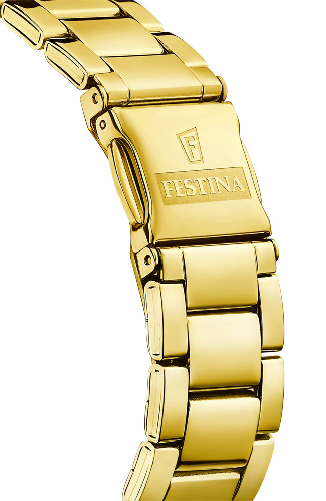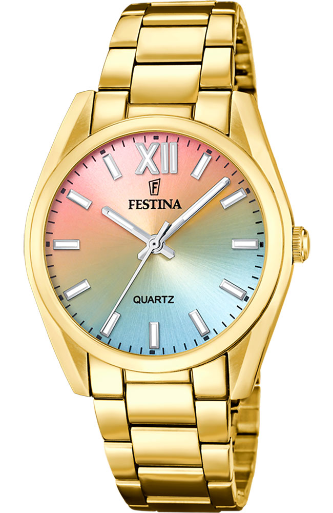 Γυναικείο ρολόι Festina από επιχρυσωμένο ανοξείδωτο ατσάλι με πολύχρωμο καντράν και χρυσό μπρασελέ.