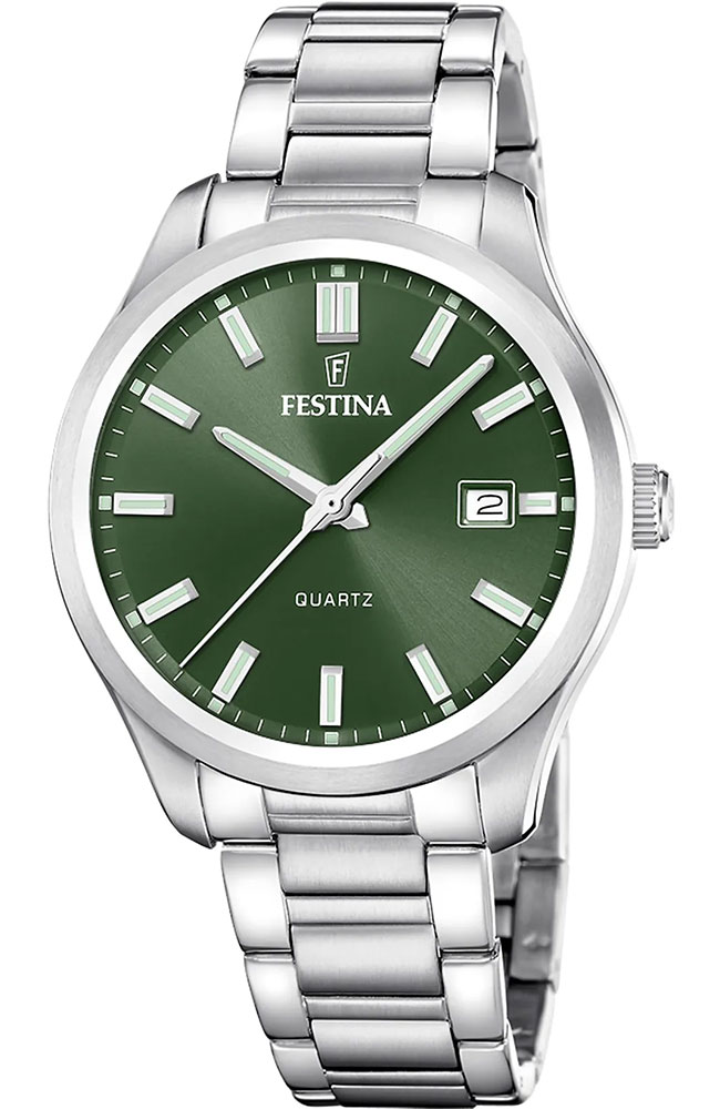 Ανδρικό ρολόι Festina από ανοξείδωτο ατσάλι με πράσινο καντράν και ασημί μπρασελέ.