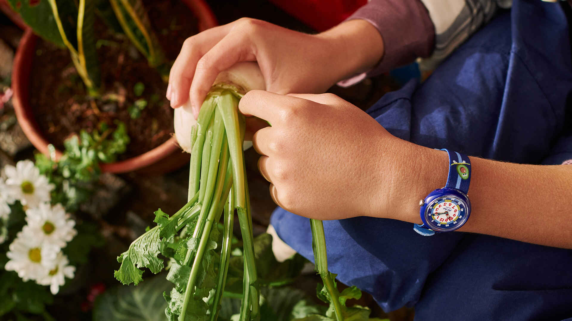 Παιδικό ρολόι Flik Flak με λευκό καντράν και μπλε υφασμάτινο λουράκι.
