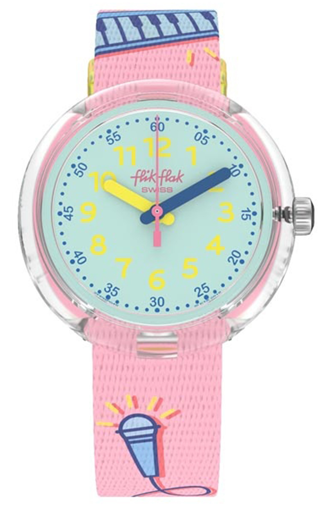 Παιδικό ρολόι Flik Flak με πράσινο καντράν και ροζ υφασμάτινο λουράκι.