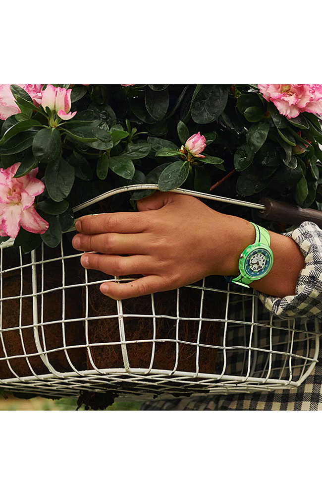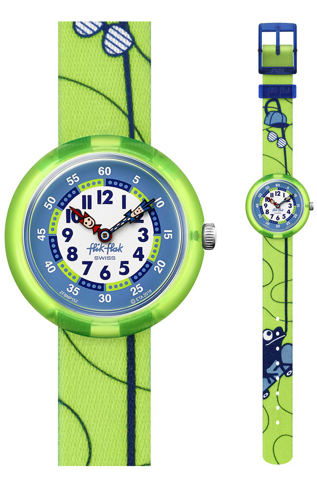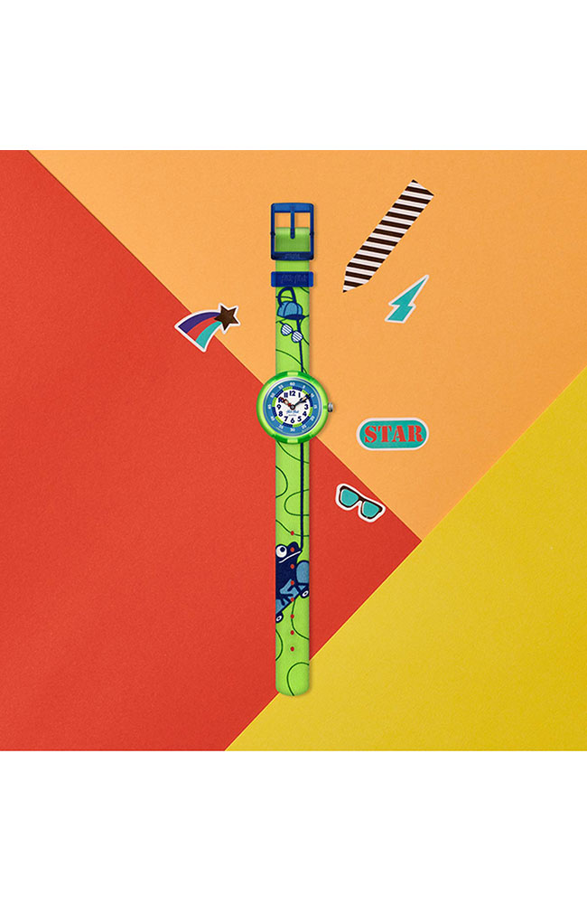 Παιδικό ρολόι Flik Flak με δίχρωμο καντράν και πράσινο υφασμάτινο λουράκι.
