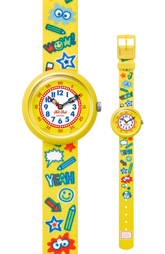 Παιδικό ρολόι Flik Flak με λευκό καντράν και κίτρινο υφασμάτινο λουράκι.