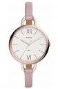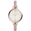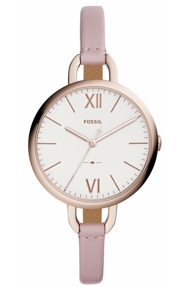 Γυναικείο ρολόι Fossil από ροζ επιχρυσωμένο ανοξείδωτο ατσάλι με λευκό καντράν και ροζ δερμάτινο λουράκι.