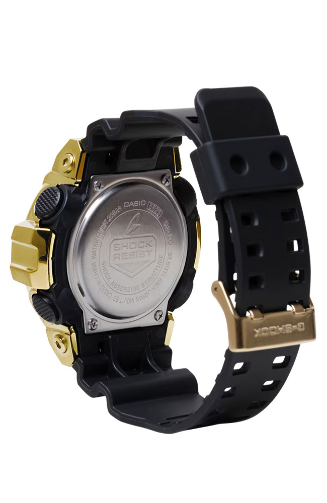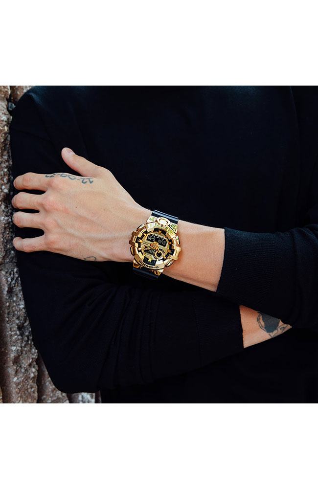 Ανδρικό ρολόι από τη σειρά G-shock της G-SHOCK ένα κλασσικό ρολόι με χρυσό καντράν και μαύρο καουτσούκ λουράκι.