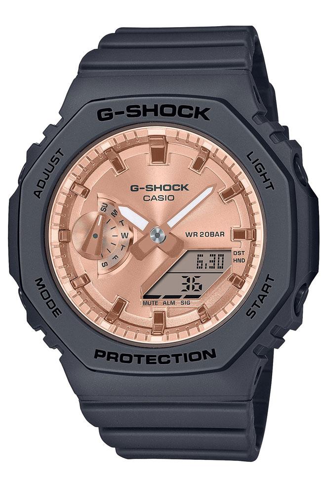 Ανδρικό ρολόι χειρός G-SHOCK ανθεκτικό στους κραδασμούς με ροζ χρυσό καντράν και μαύρο καουτσούκ λουράκι.
