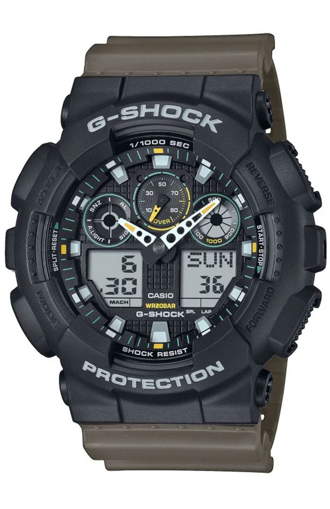 Ανδρικό ρολόι χειρός G-SHOCK από ανοξείδωτο ατσάλι με ψηφιακό καντράν και καφέ καουτσούκ λουράκι.