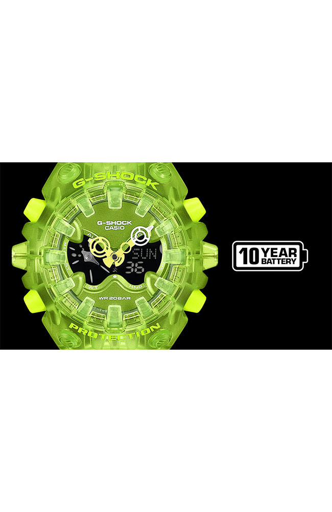 Η κεντρική κάσα που προστατεύει τον μηχανισμό καλύπτεται από ένα εξωτερικό περίβλημα με ενιαία κατασκευή στεφάνης και λουριού, ενώ οι μεγάλοι τρισδιάστατοι δείκτες εκτείνονται πάνω από το γυαλί λειτουργώντας και ως απορροφητικά προστατευτικά κραδασμών. Αυτός ο μοναδικά δυναμικός σχεδιασμός προσφέρει μια εντελώς νέα εμφάνιση, διατηρώντας παράλληλα την χαρακτηριστική αντοχή σε κραδασμούς της G-SHOCK.