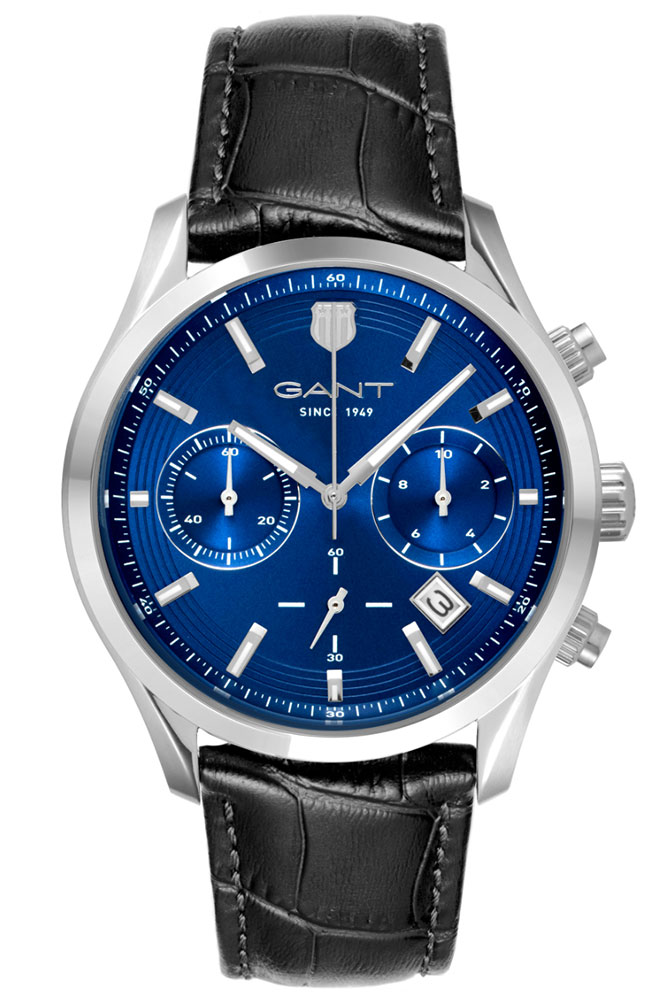 Ανδρικό ρολόι Gant Prestige Χρονογράφος, από ανοξείδωτο ατσάλι με μπλε καντράν και μαύρο δερμάτινο λουράκι.