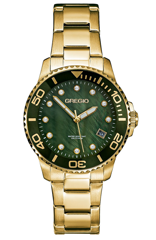 Γυναικείο ρολόι Gregio από ανοξείδωτο ατσάλι με πράσινο φίλντισι καντράν, πέτρες ζιργκόν και μπρασελέ.