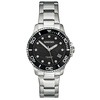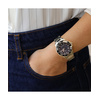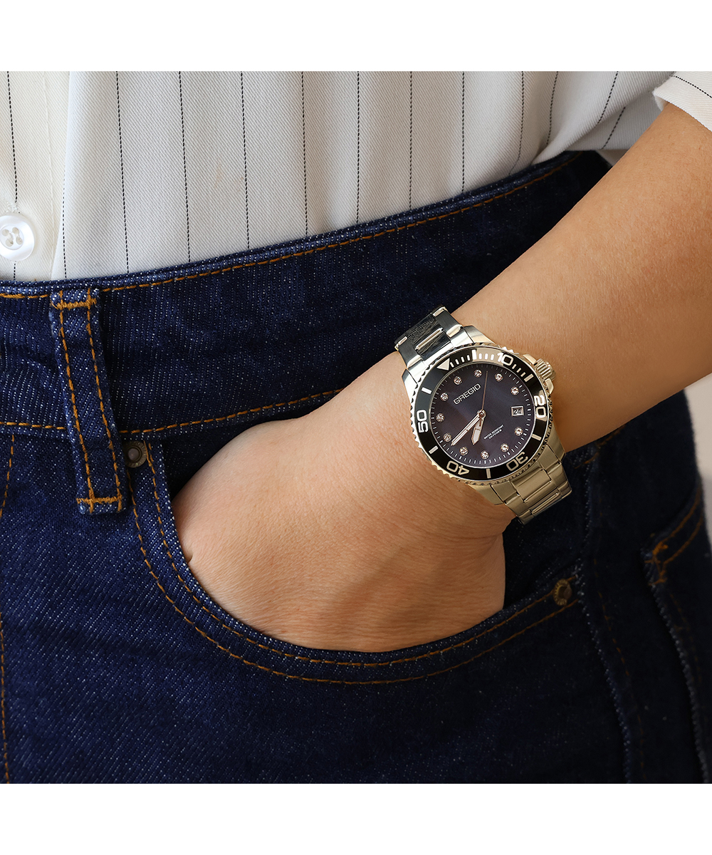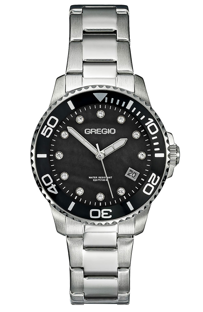 Γυναικείο ρολόι Gregio από ανοξείδωτο ατσάλι με μαύρο φίλντισι καντράν, πέτρες ζιργκόν και μπρασελέ.