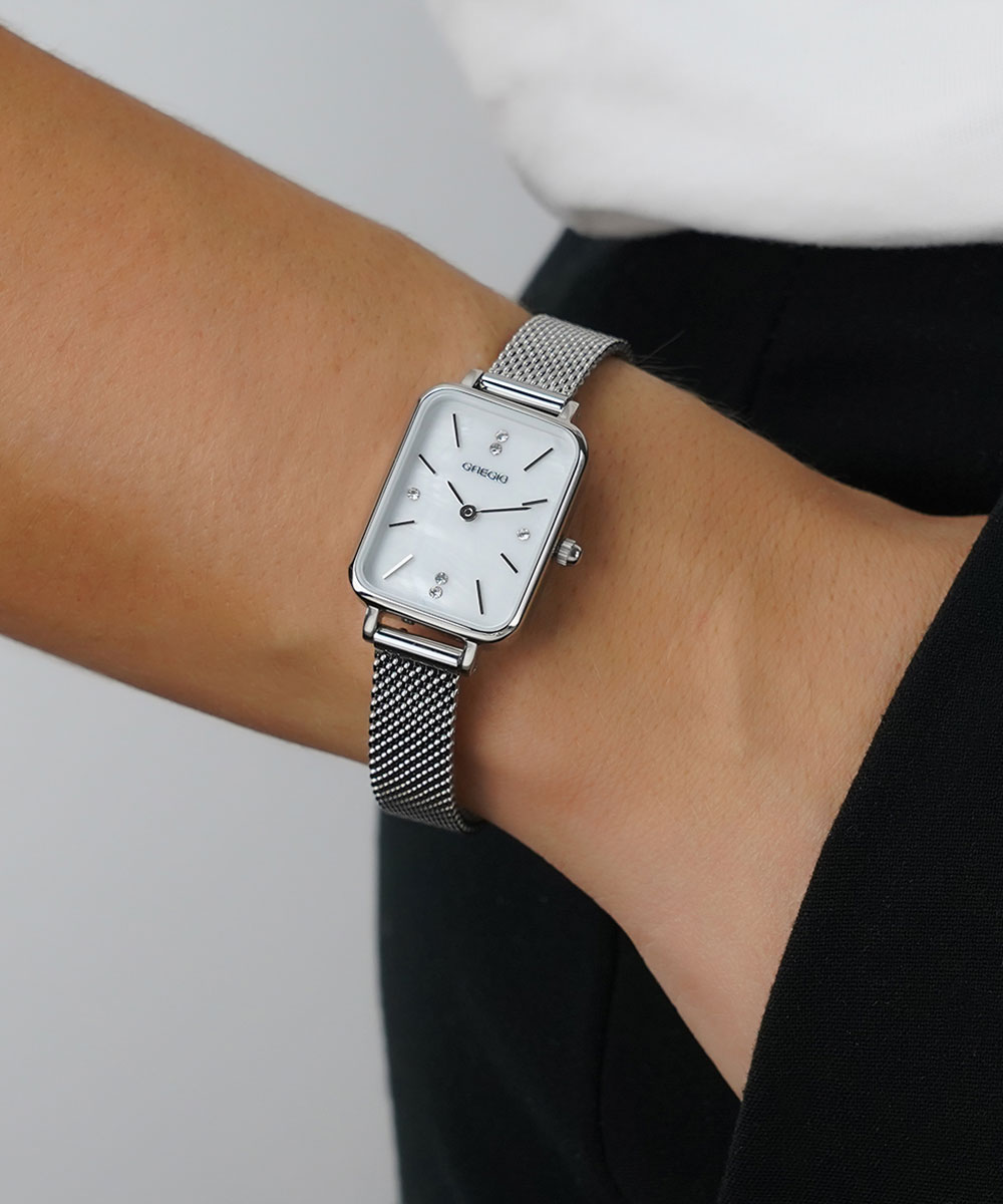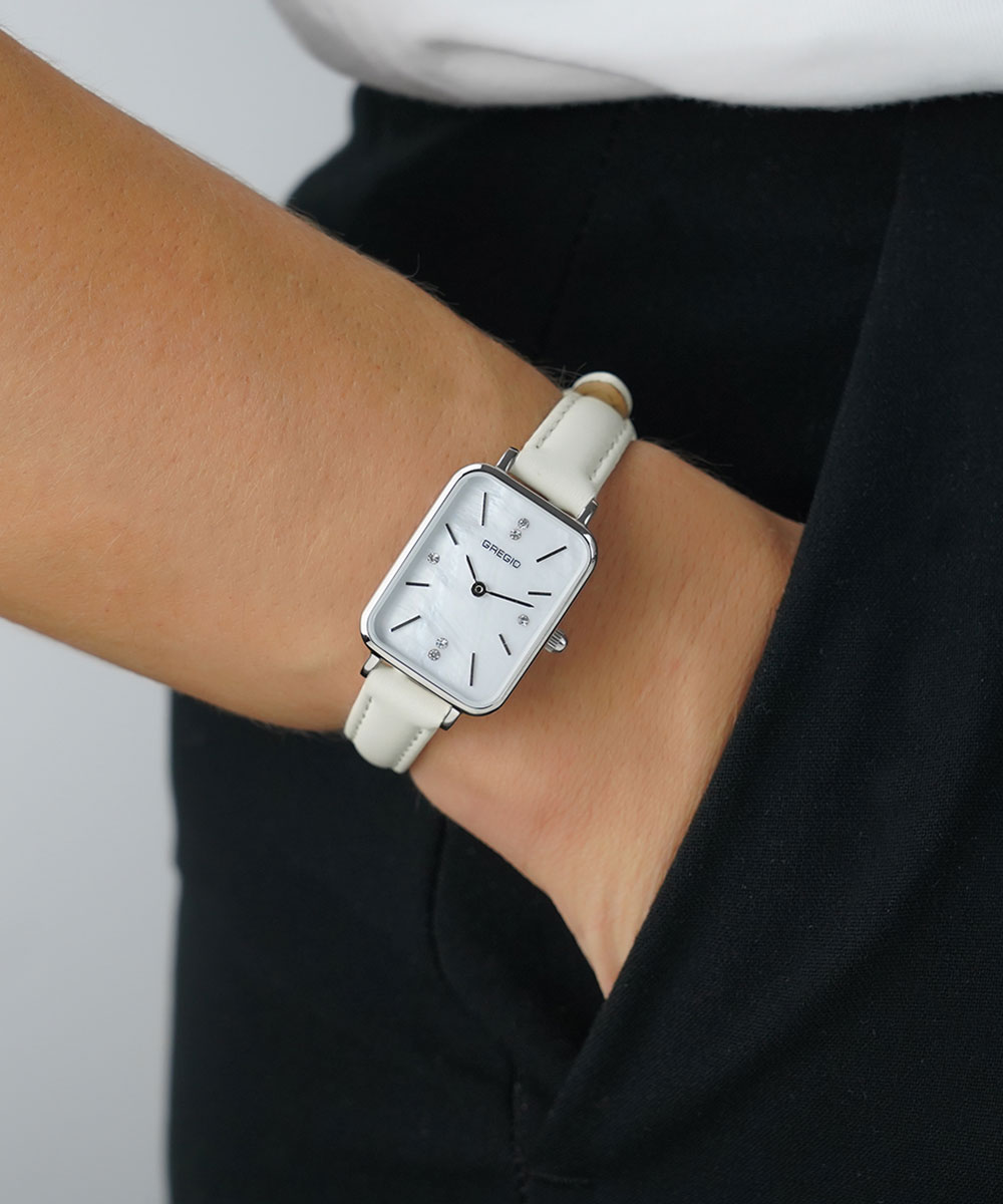 Γυναικείο ρολόι Gregio από ανοξείδωτο ατσάλι με λευκό καντράν και μπρασελέ. Σε ειδική συσκευασία που περιέχει ένα επιπλέον δερμάτινο λουράκι.