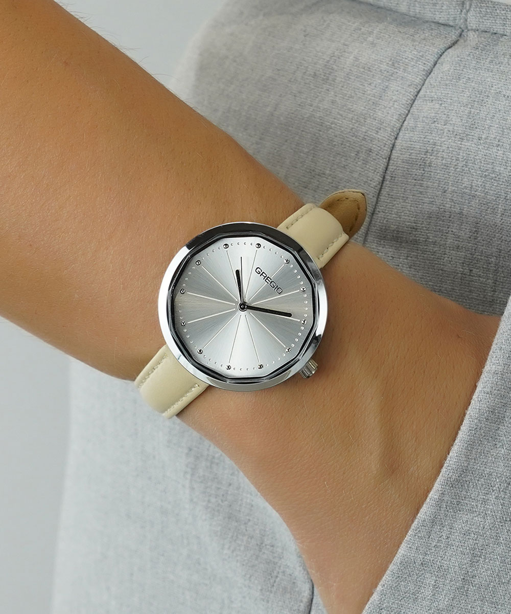 Γυναικείο ρολόι Gregio από ανοξείδωτο ατσάλι με ασημί καντράν και δερμάτινο λουράκι.