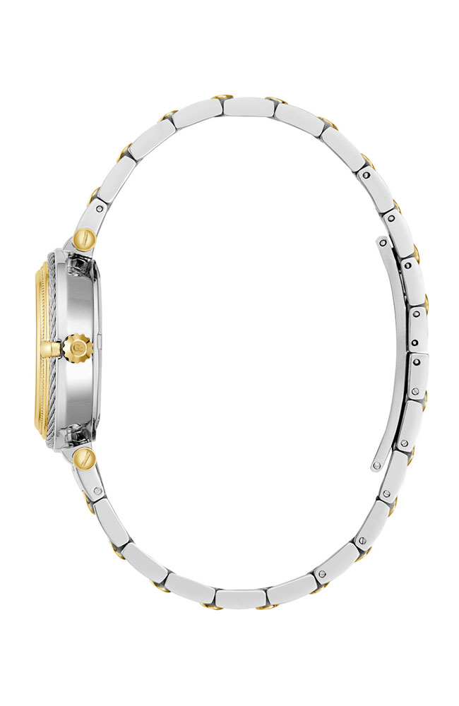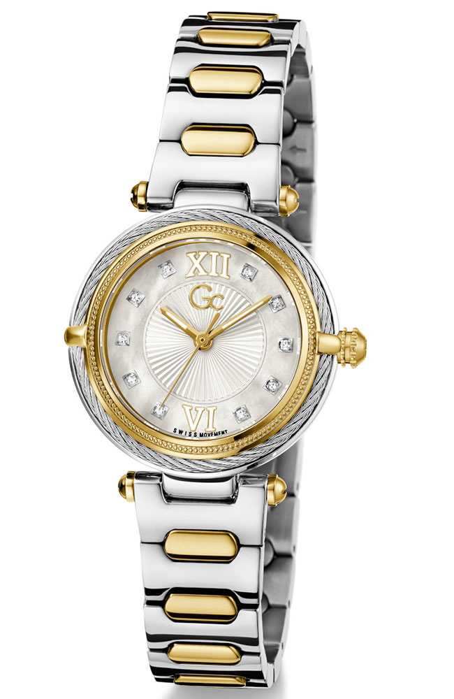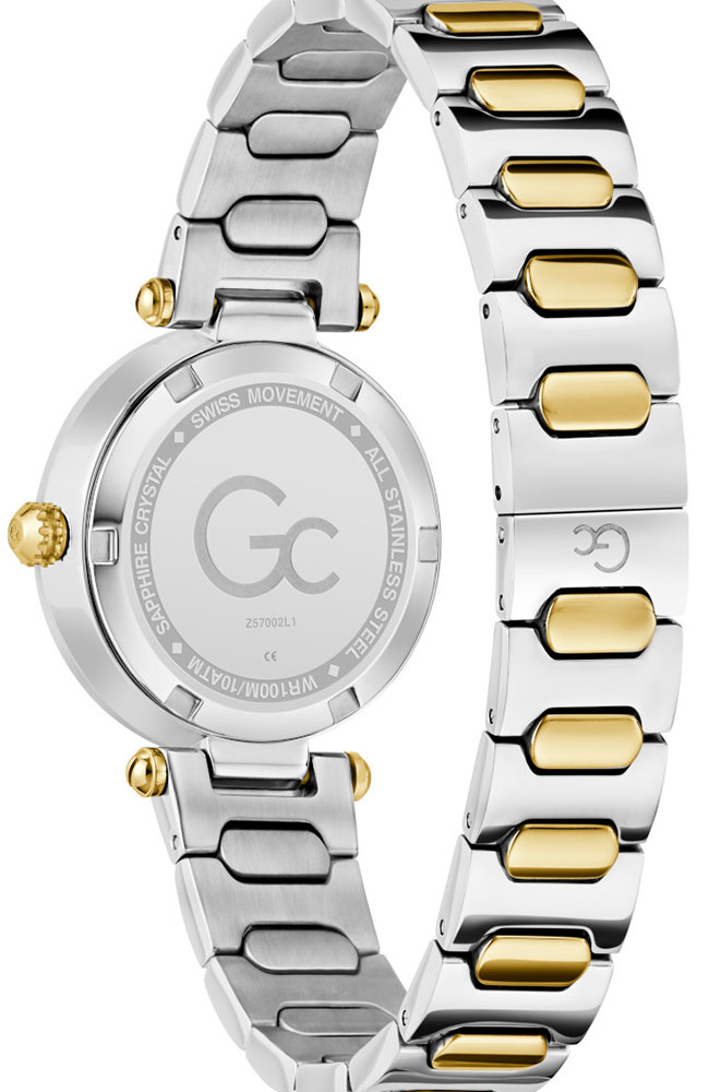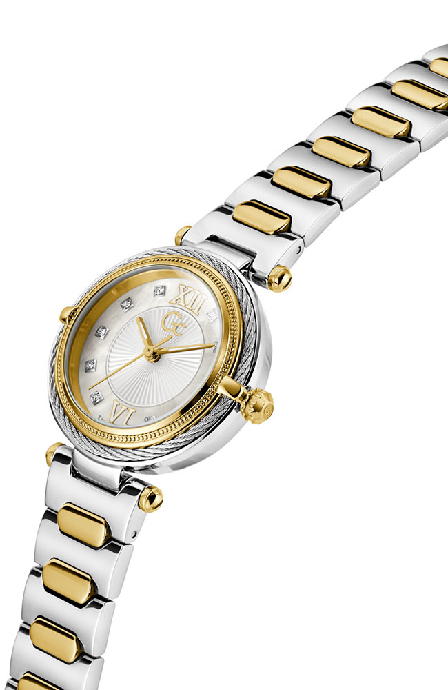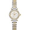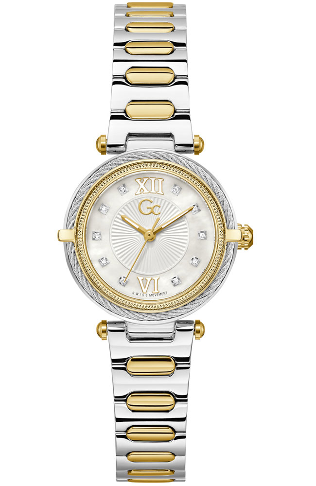 Γυναικείο ρολόι Guess Collection με Ελβετικό μηχανισμό από ανοξείδωτο ατσάλι με λευκό καντράν, πέτρες Ζιργκόν και δίχρωμο μπρασελέ.
