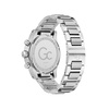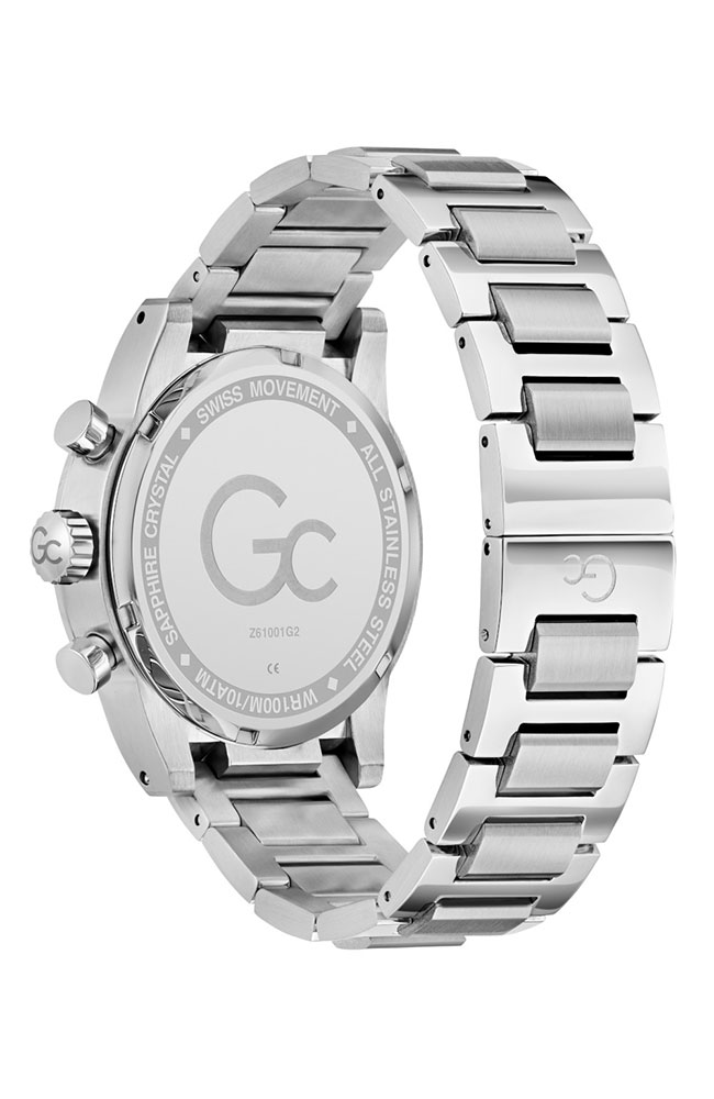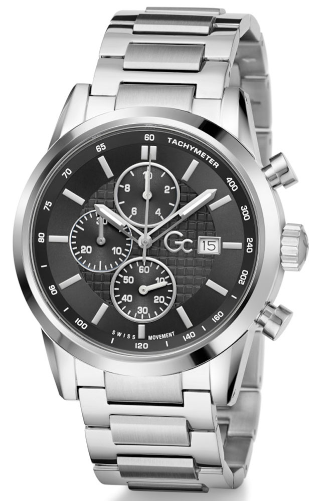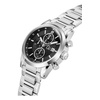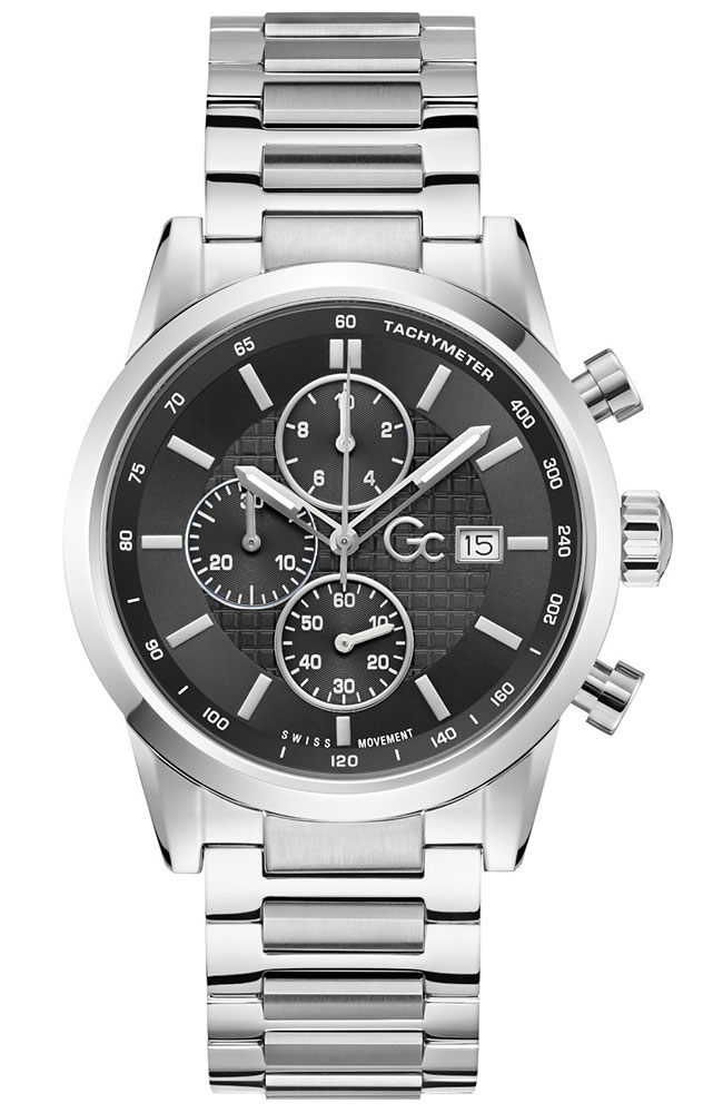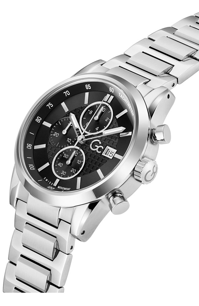 Ανδρικό ρολόι χρονογράφος Guess Collection με Ελβετικό μηχανισμό από ανοξείδωτο ατσάλι με μαύρο καντράν και ασημί μπρασελέ.
