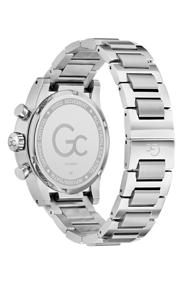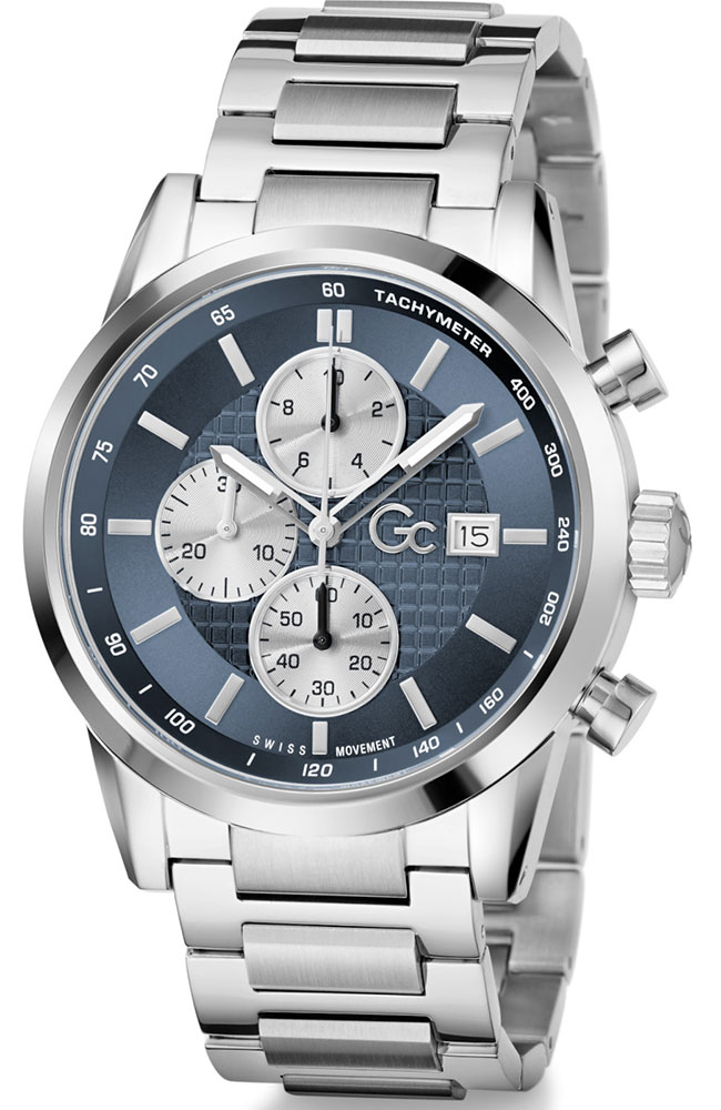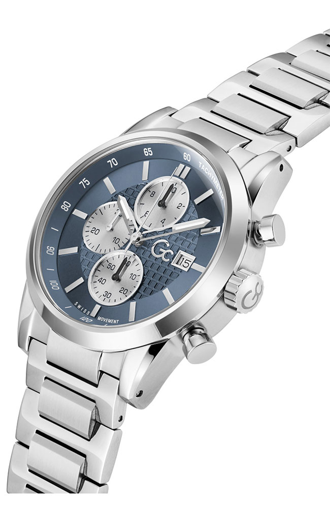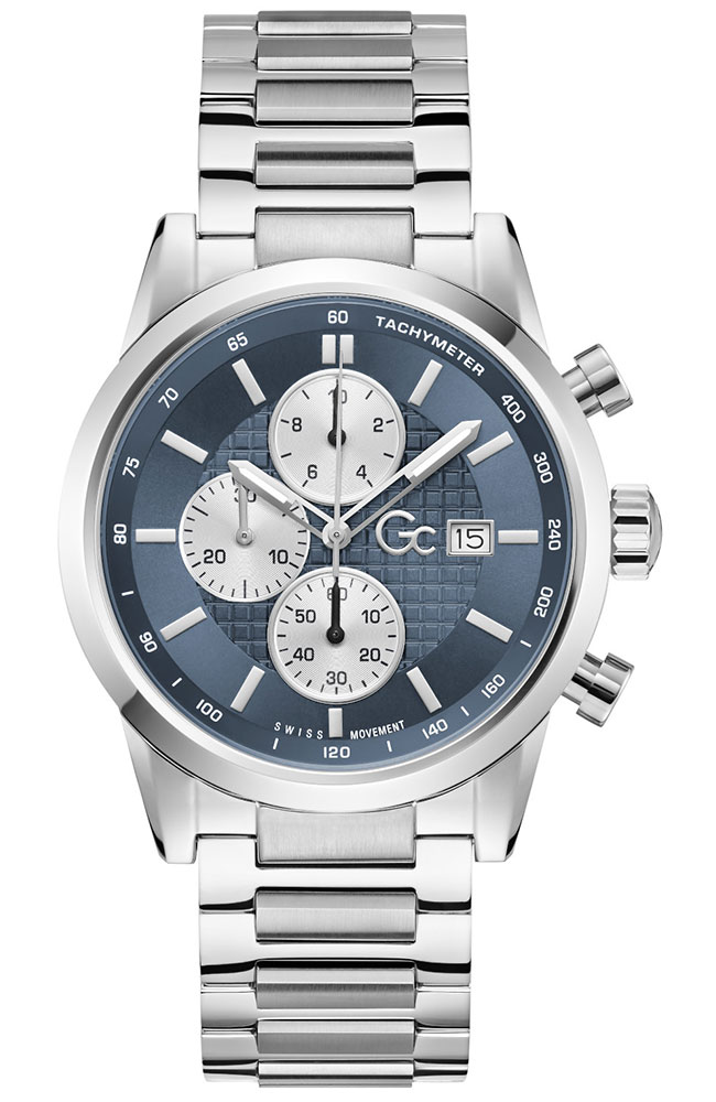 Ανδρικό ρολόι χρονογράφος Guess Collection με Ελβετικό μηχανισμό από ανοξείδωτο ατσάλι με μπλε καντράν και ασημί μπρασελέ.