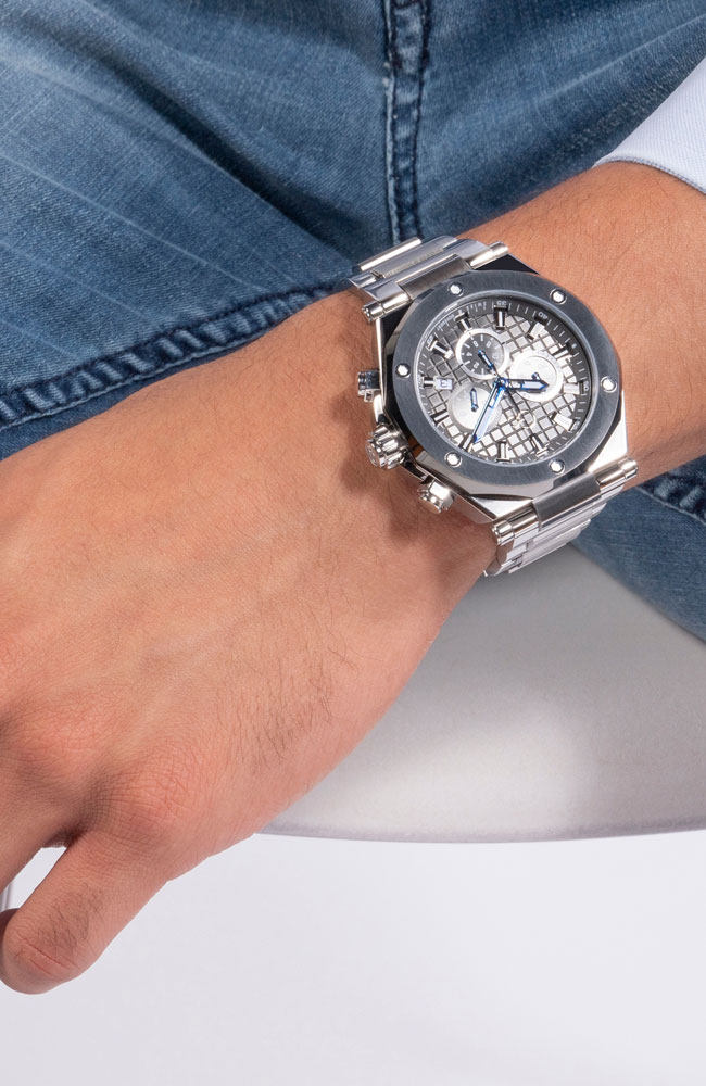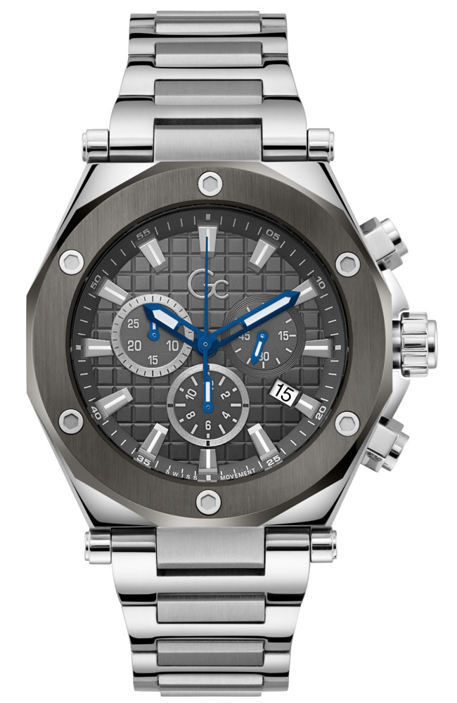 Ανδρικό ρολόι GUESS με ελβετικό μηχανισμό, από ανοξείδωτο ατσάλι με γκρι καντράν και μπρασελέ.