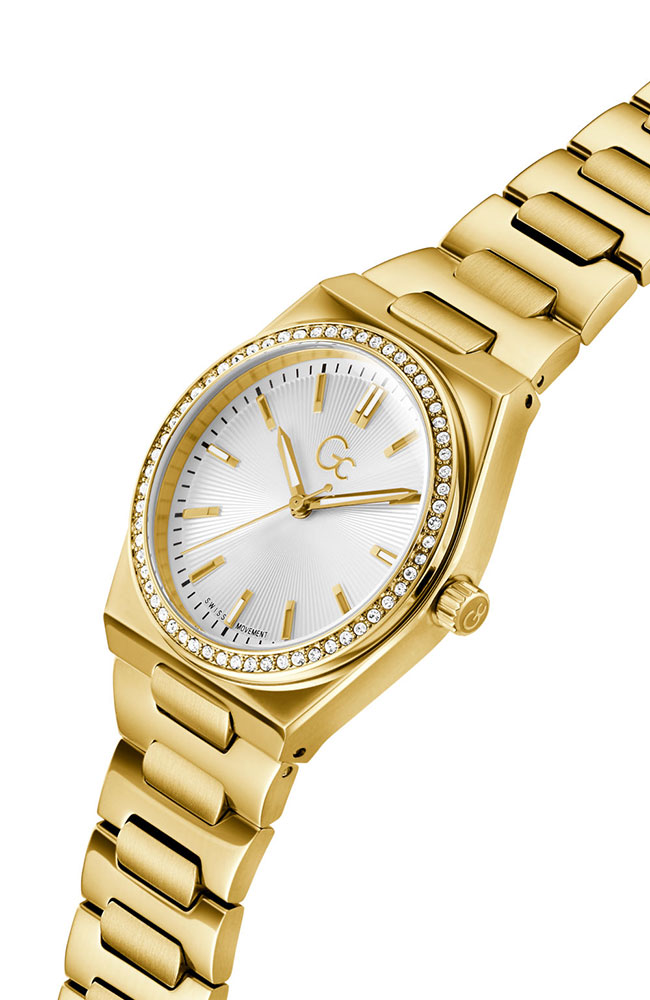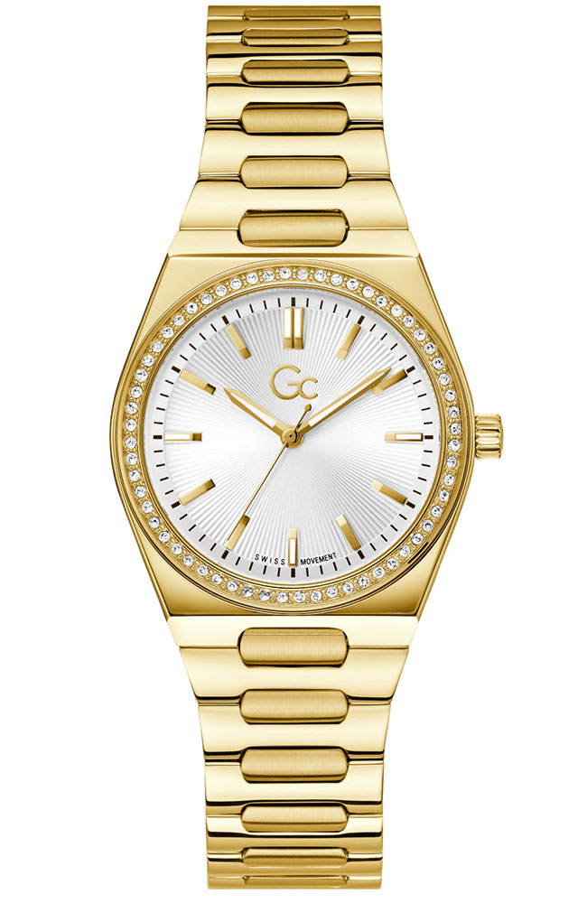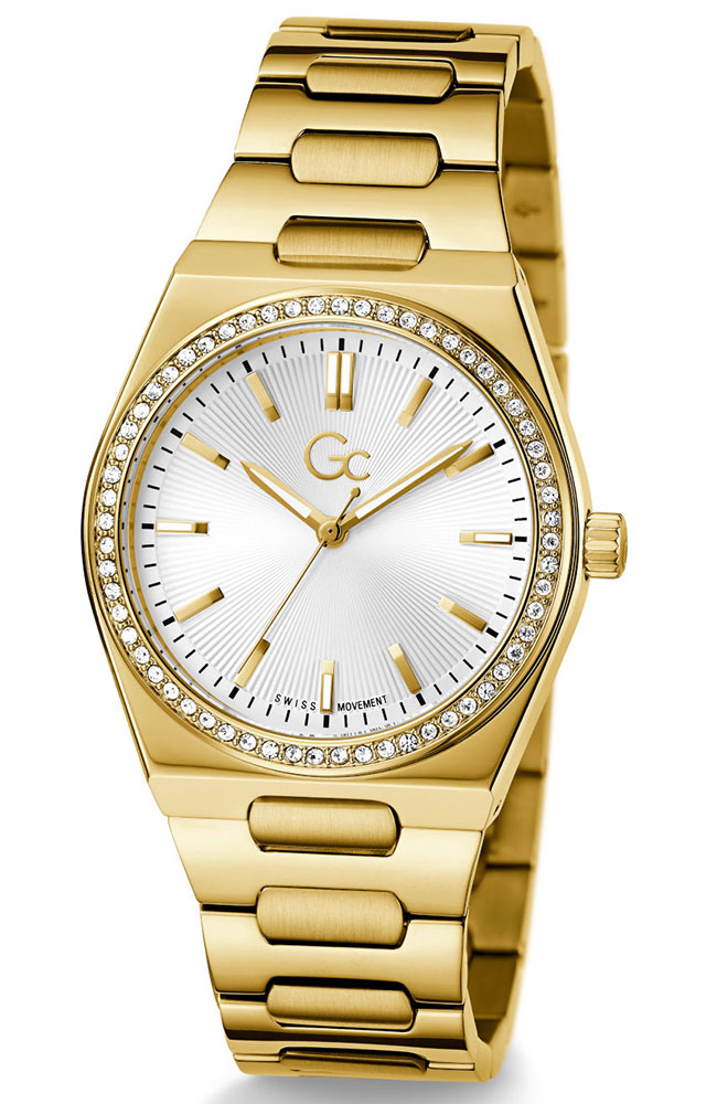 Γυναικείο ρολόι Guess Collection με ελβετικό μηχανισμό από ανοξείδωτο ατσάλι με ασημί καντράν, πέτρες Ζιργκόν και μπρασελέ.