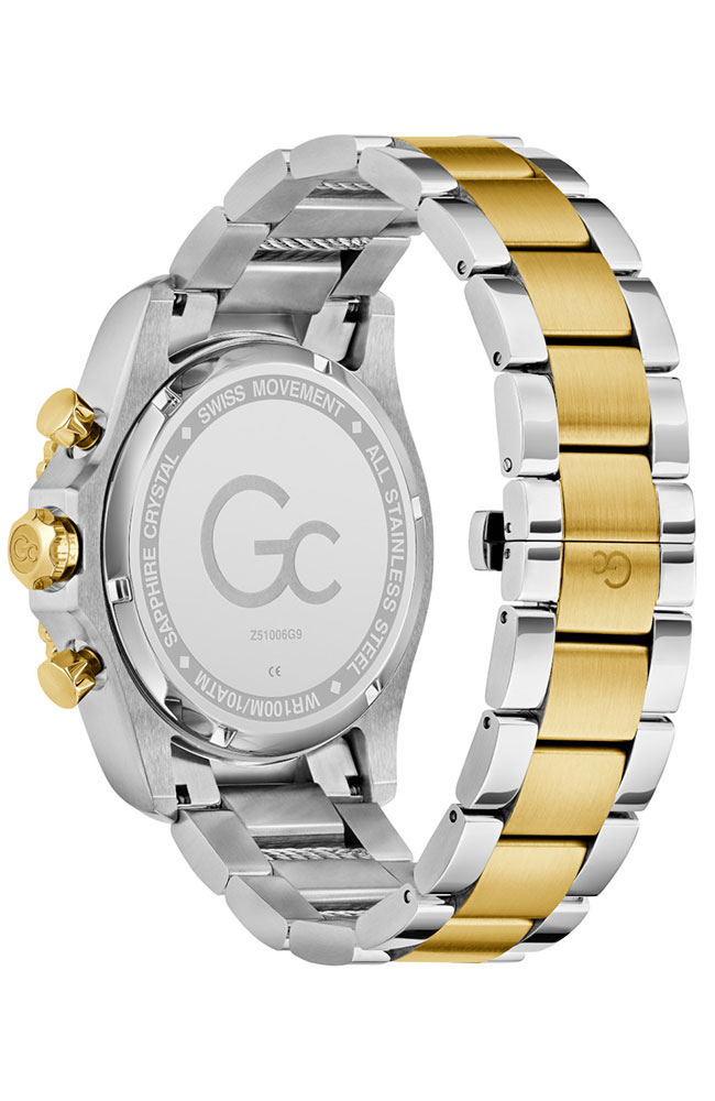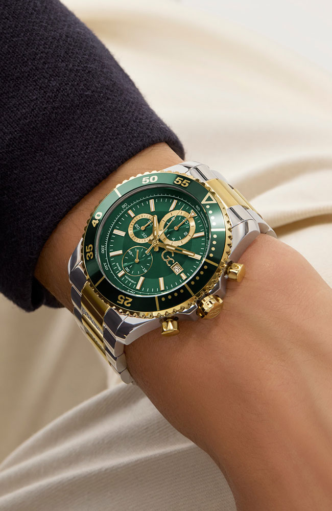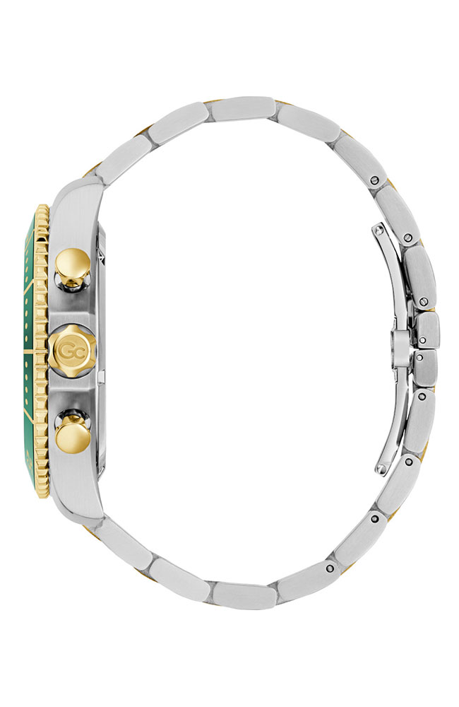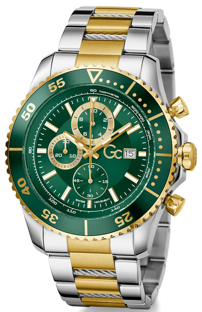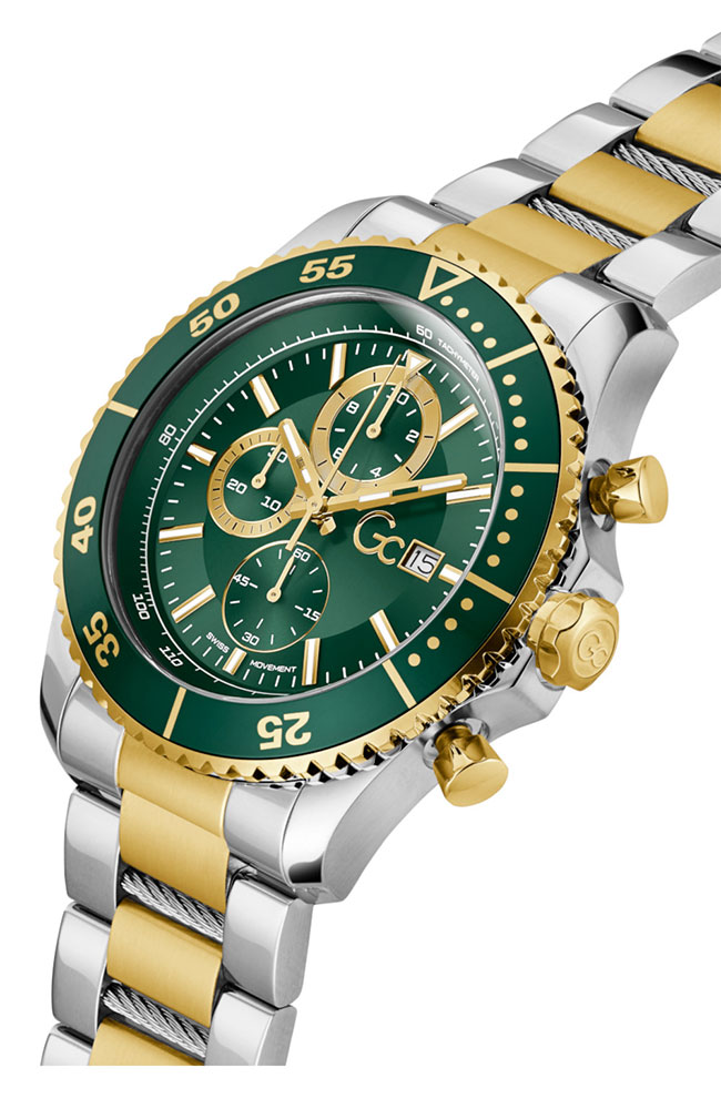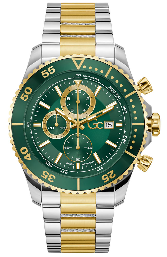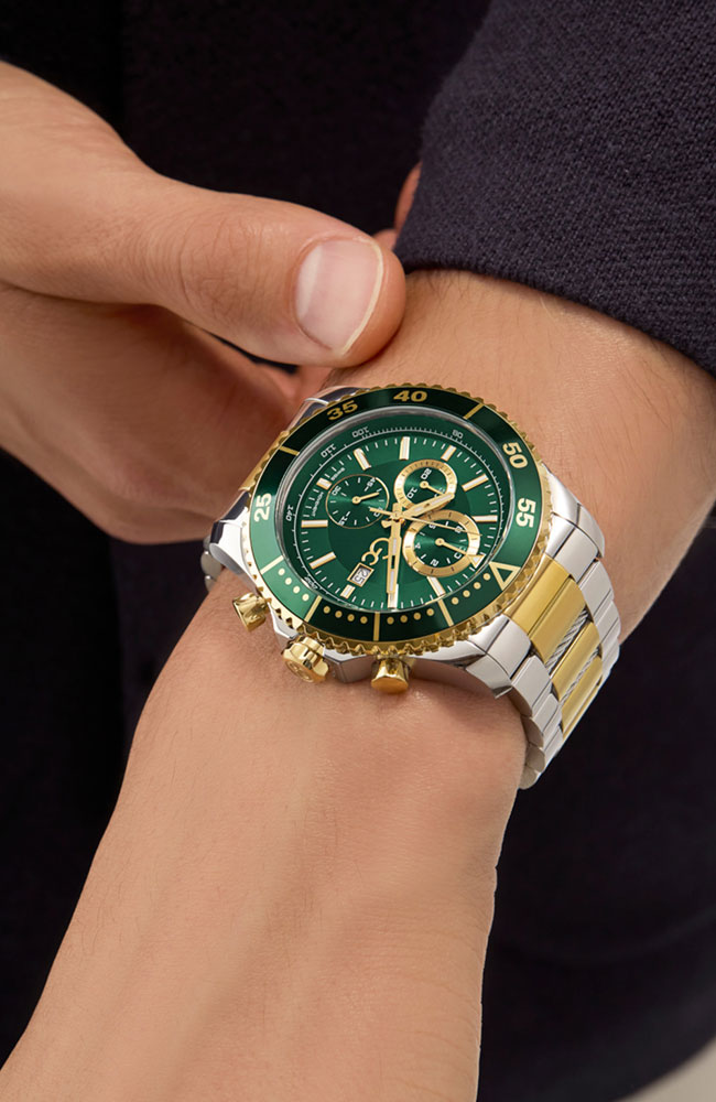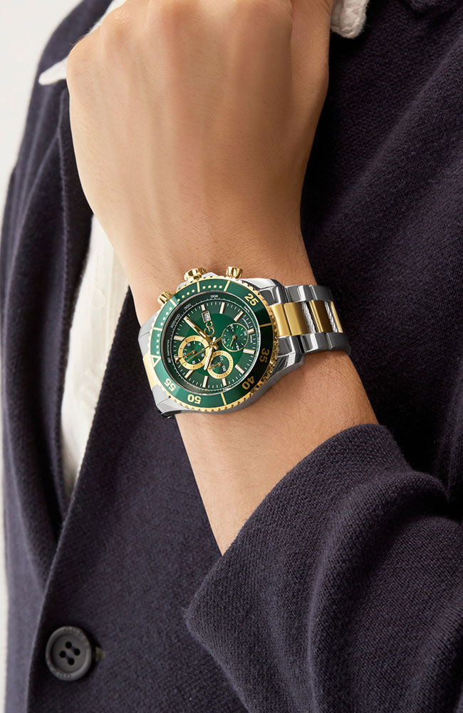 Ανδρικό ρολόι χρονογράφος Guess Collection με Ελβετικό μηχανισμό από ανοξείδωτο ατσάλι με πράσινο καντράν και δίχρωμο μπρασελέ.