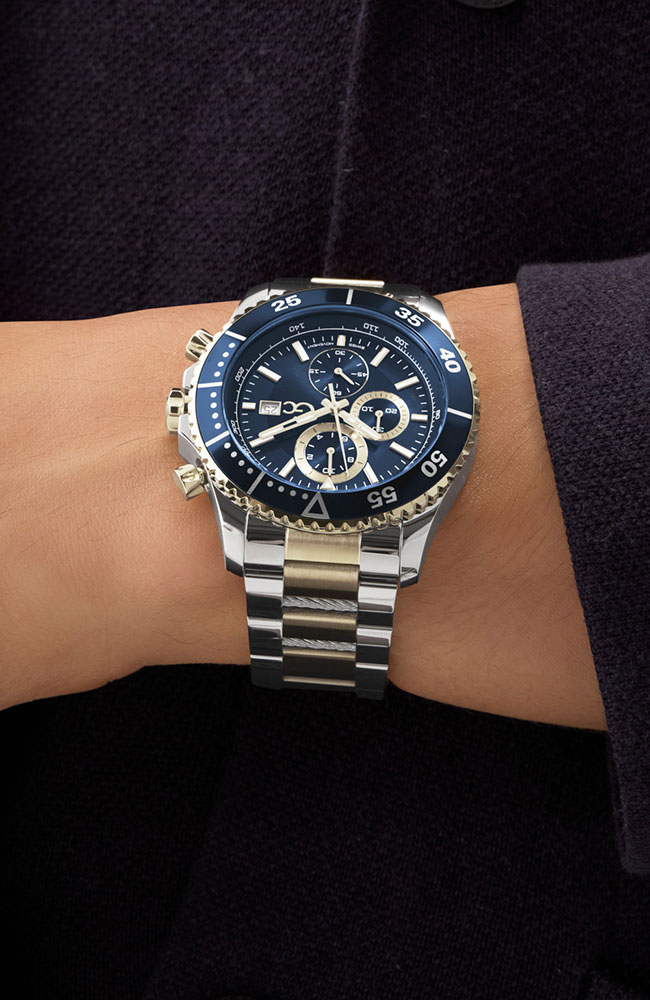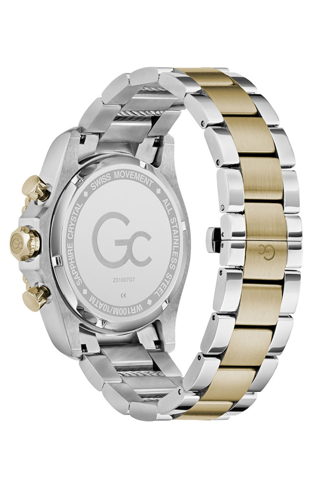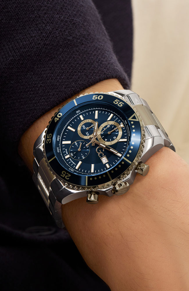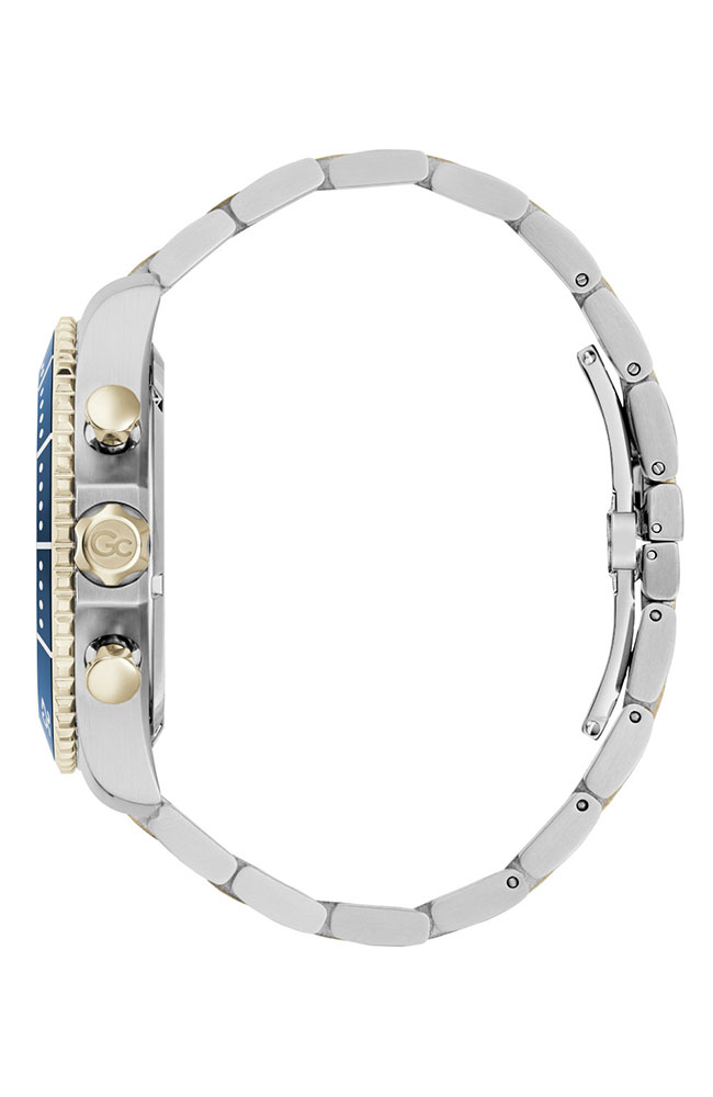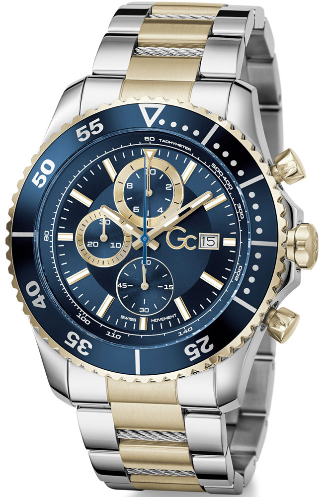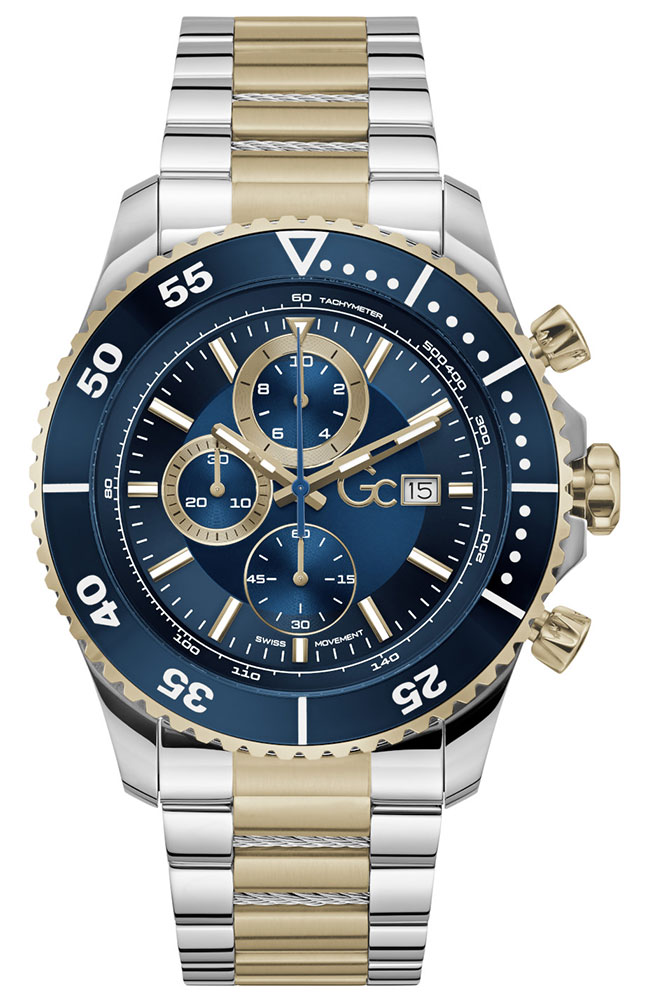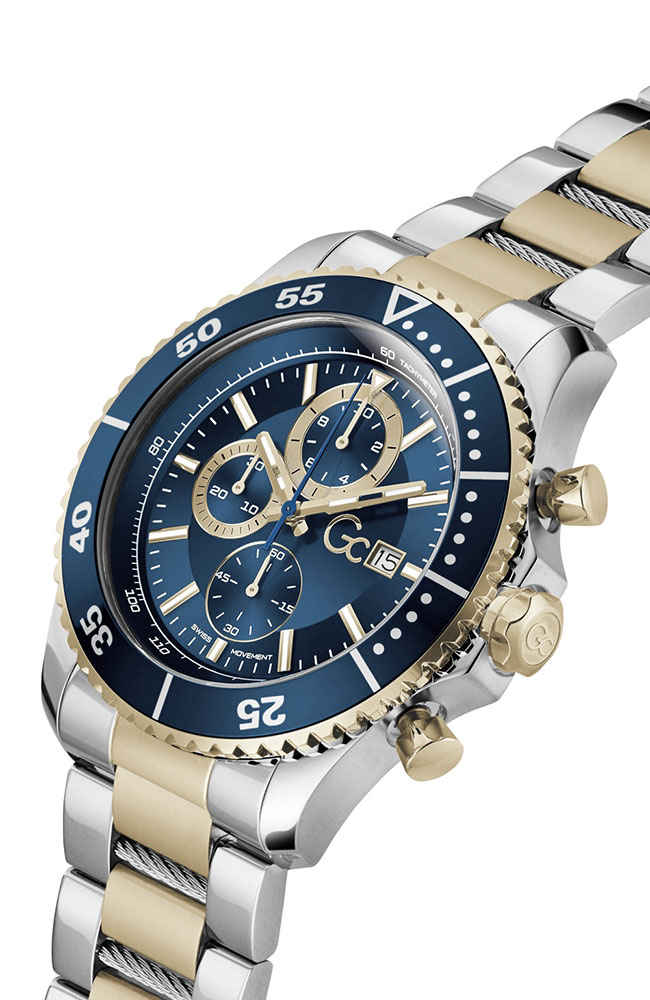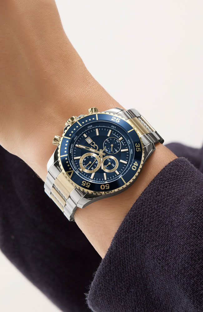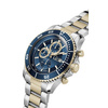 Ανδρικό ρολόι χρονογράφος Guess Collection με Ελβετικό μηχανισμό από ανοξείδωτο ατσάλι με μπλε καντράν και δίχρωμο μπρασελέ.