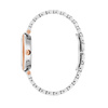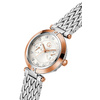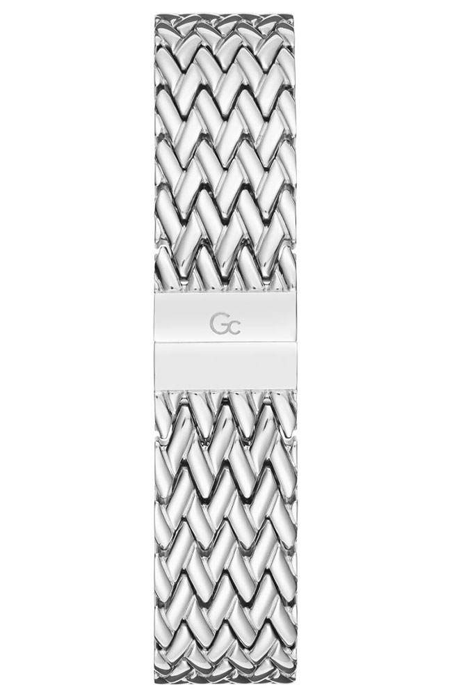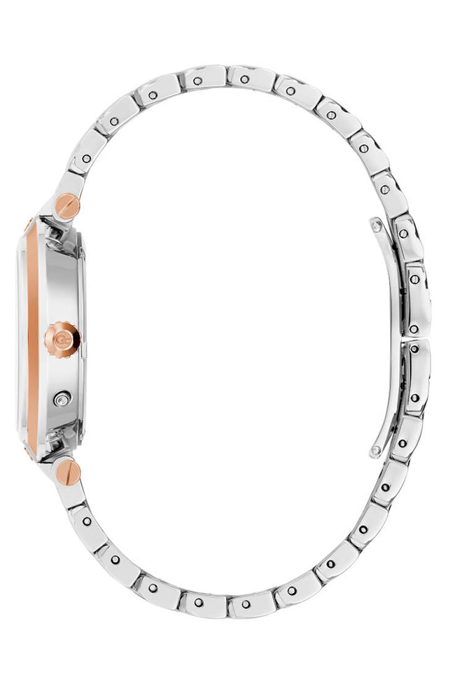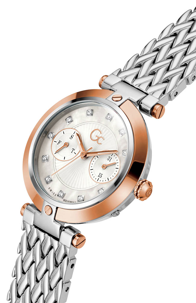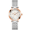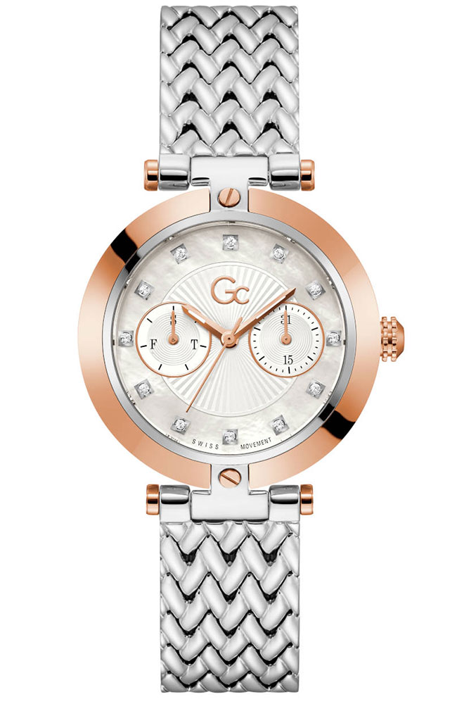 Γυναικείο ρολόι Guess Collection με ελβετικό μηχανισμό από ροζ επιχρυσωμένο ανοξείδωτο ατσάλι με λευκό φίλντισι καντράν, πέτρες Ζιργκόν και ασημί μπρασελέ.