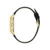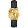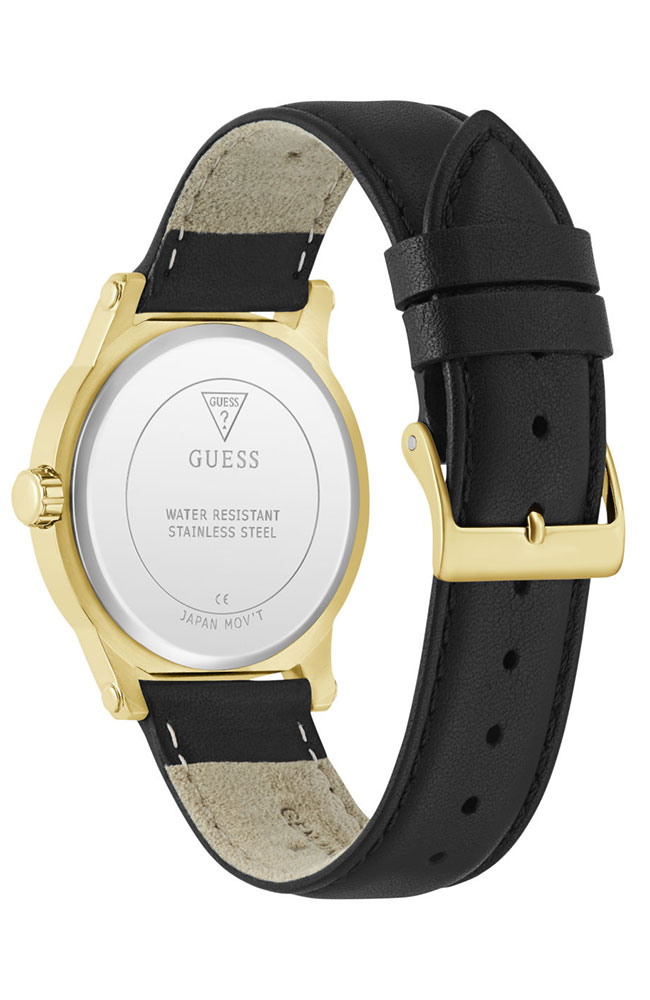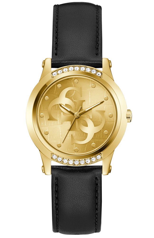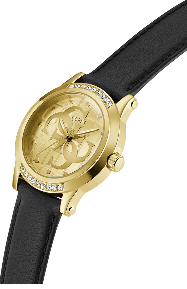 Γυναικείο ρολόι Guess από επιχρυσωμένο ανοξείδωτο ατσάλι με χρυσό καντράν, πέτρες Ζιργκόν και μαύρο δερμάτινο λουράκι.