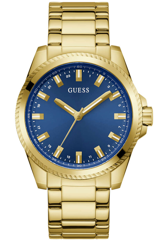 Ανδρικό ρολόι GUESS από επιχρυσωμένο ανοξείδωτο ατσάλι με μπλε καντράν και χρυσό μπρασελέ.