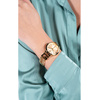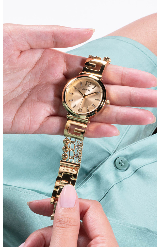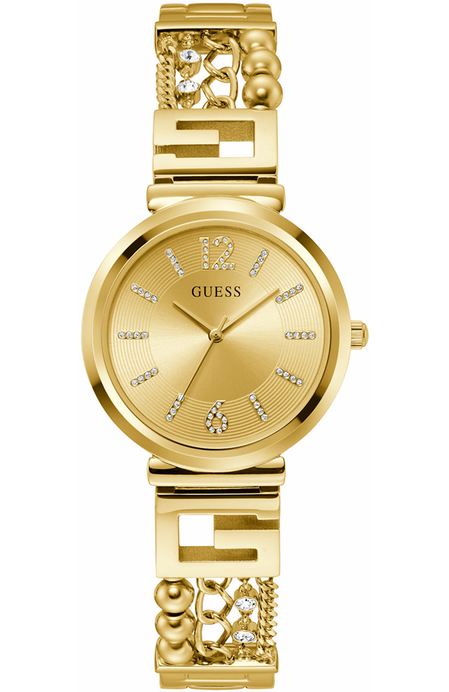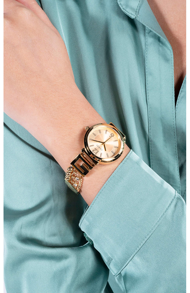Γυναικείο ρολόι Guess από επιχρυσωμένο ανοξείδωτο ατσάλι με χρυσό καντράν, πέτρες ζιργκόν και μπρασελέ.