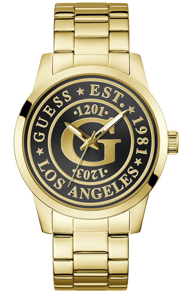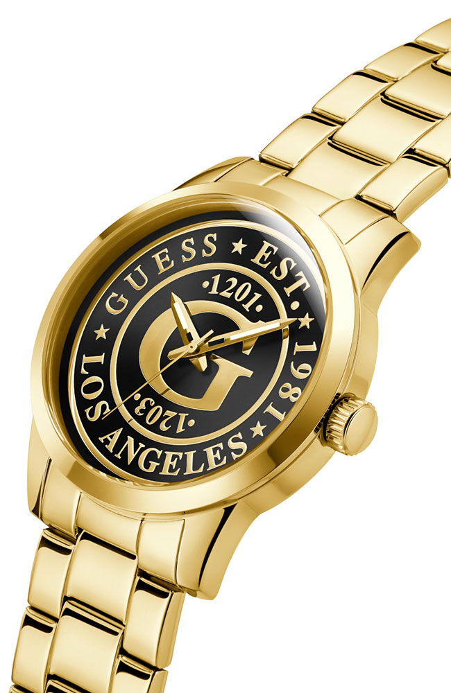 Ανδρικό ρολόι GUESS από επιχρυσωμένο ανοξείδωτο ατσάλι με μαύρο καντράν και χρυσό μπρασελέ.