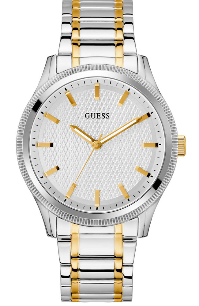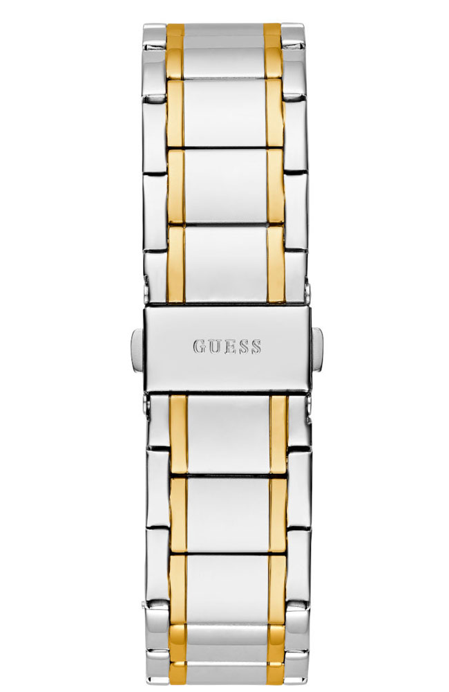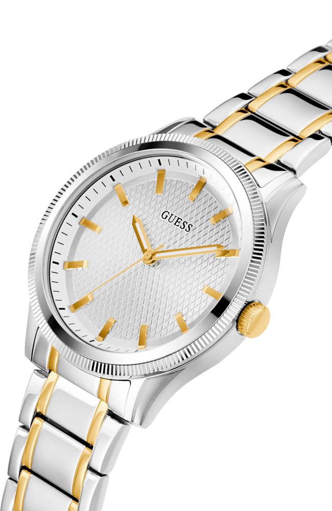 Ανδρικό ρολόι GUESS από ανοξείδωτο ατσάλι με ασημί καντράν και δίχρωμο μπρασελέ.