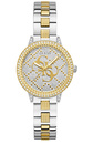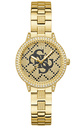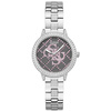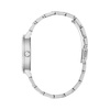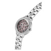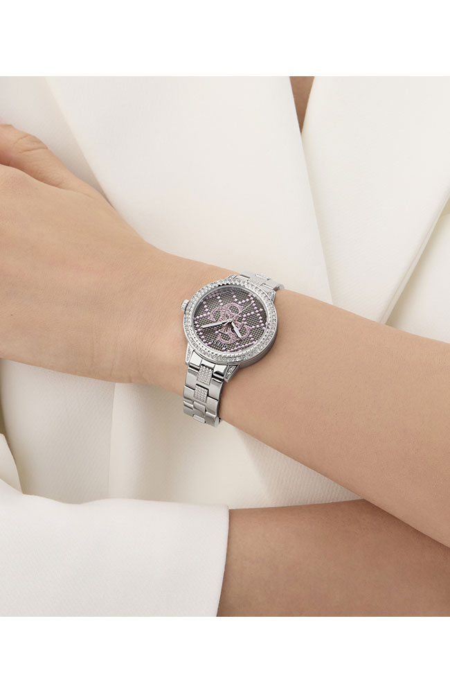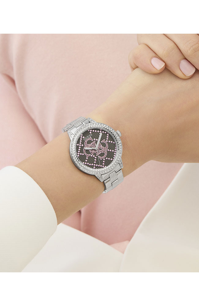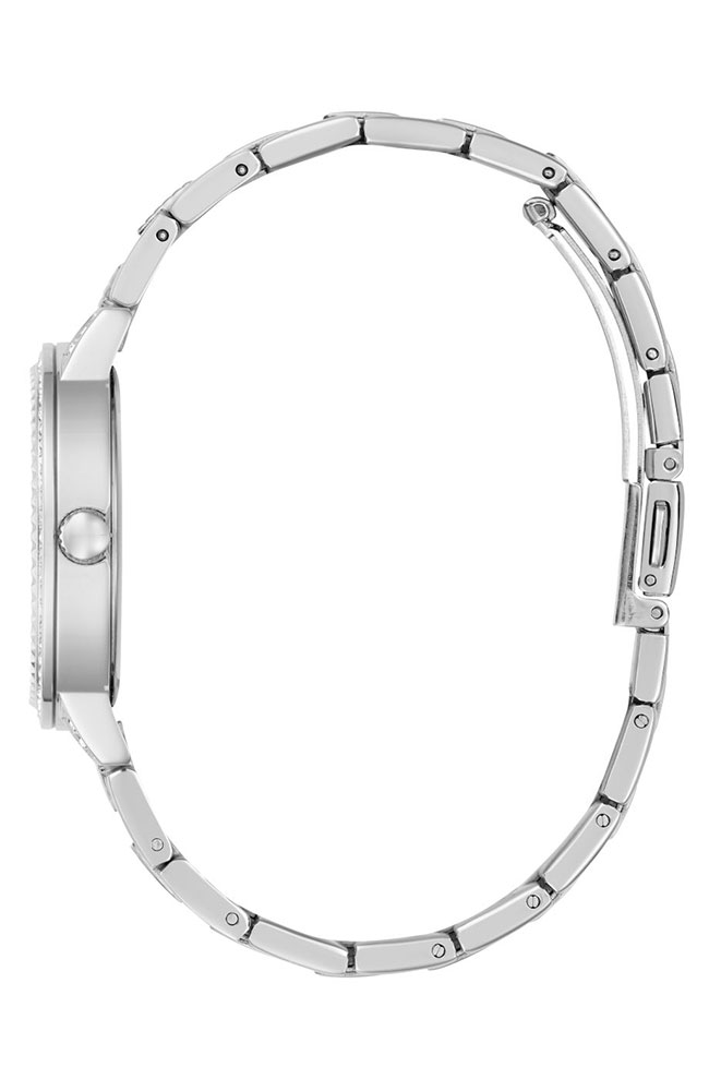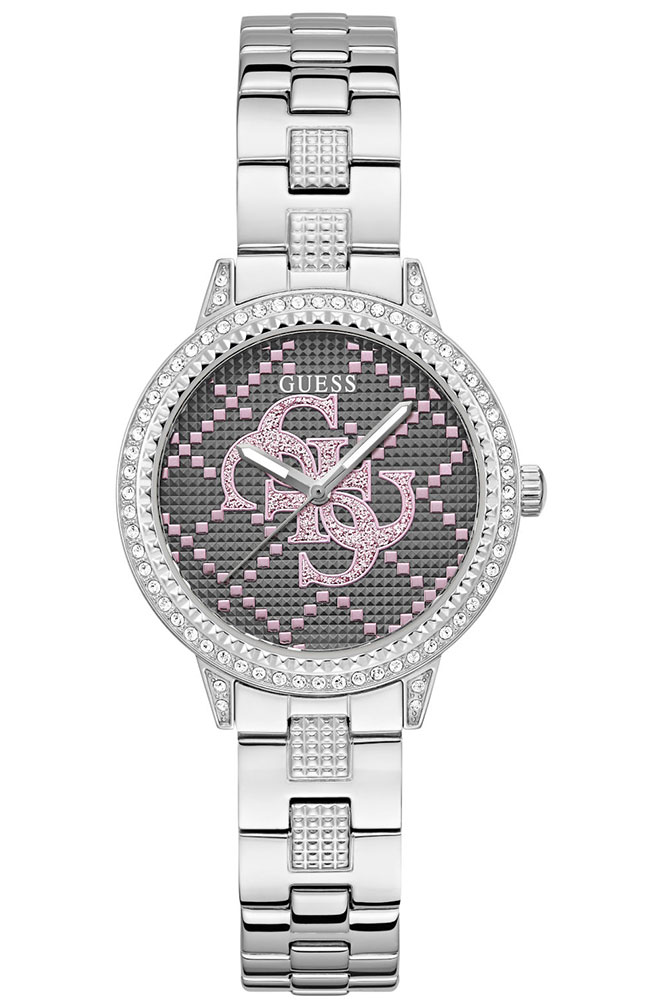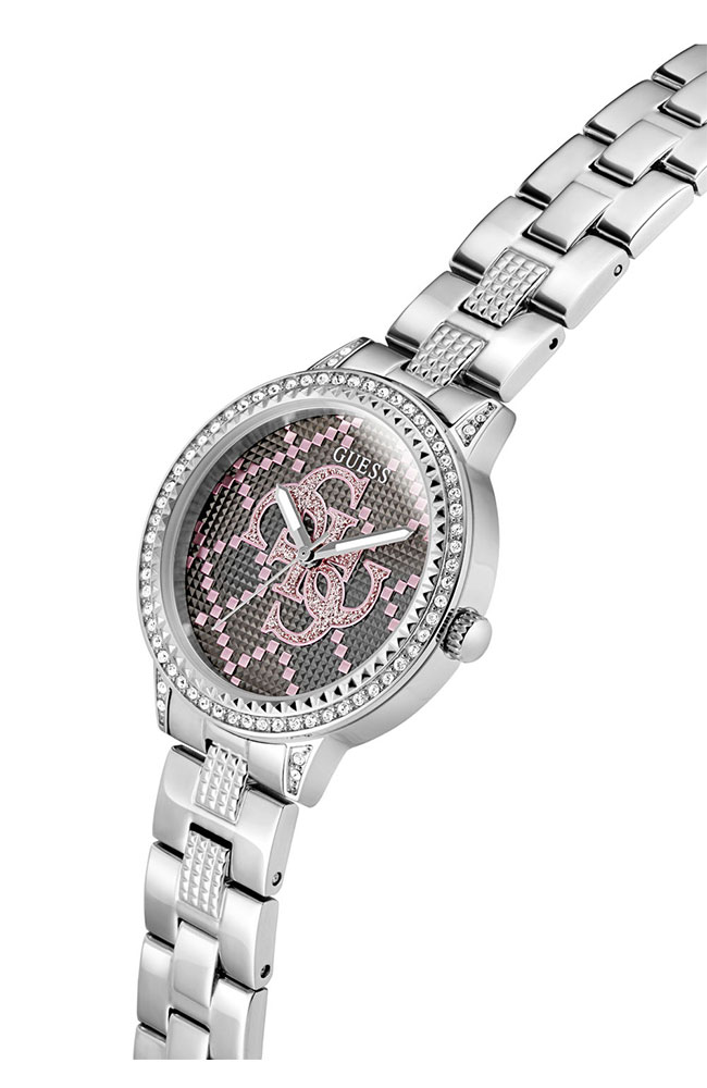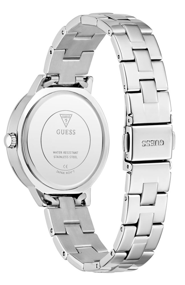 Γυναικείο ρολόι Guess από ανοξείδωτο ατσάλι με μαύρο καντράν, πέτρες Ζιργκόν και ασημί μπρασελέ.
