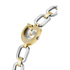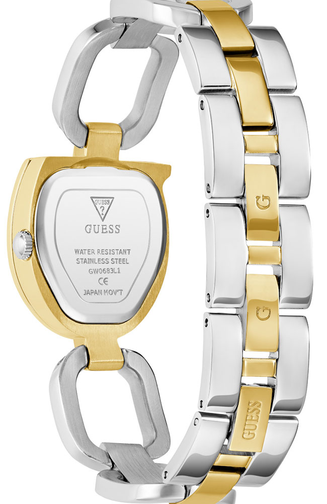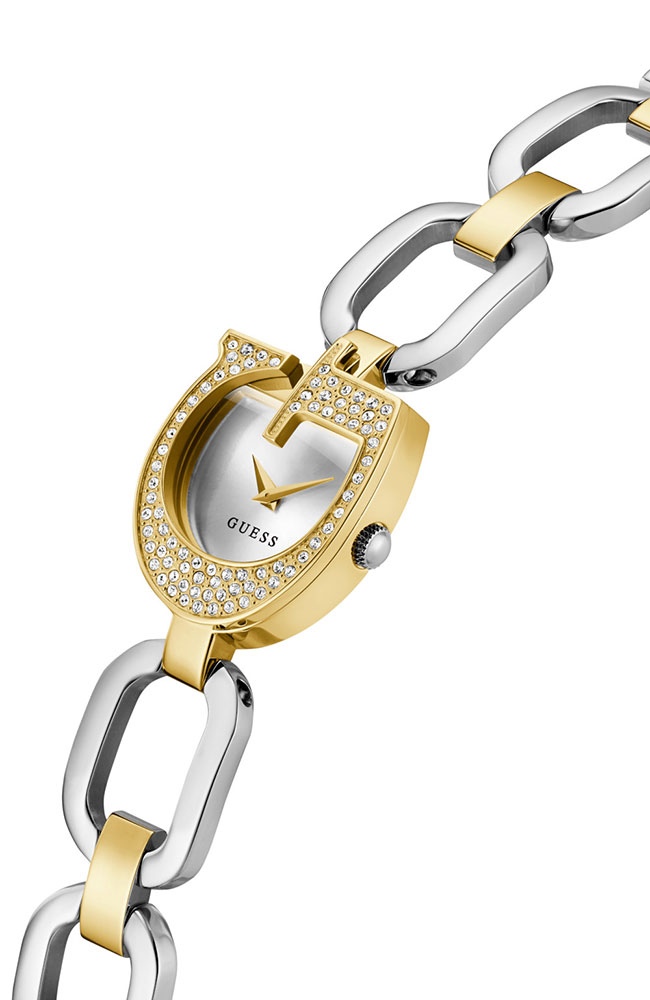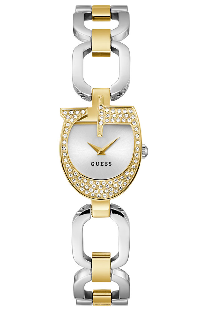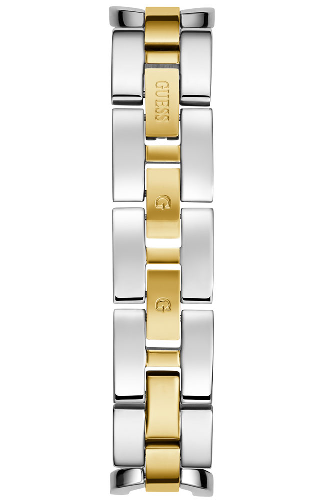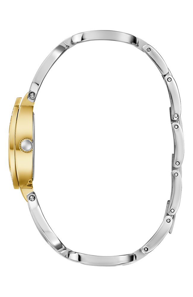 Γυναικείο ρολόι Guess από ροζ επιχρυσωμένο ανοξείδωτο ατσάλι με ασημί καντράν, πέτρες Ζιργκόν και μπρασελέ.