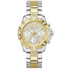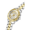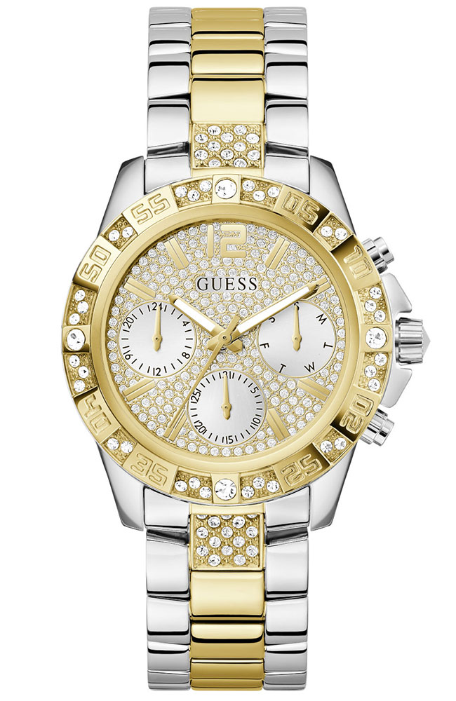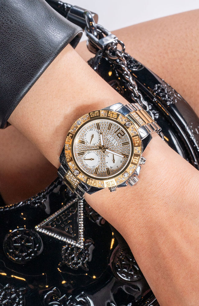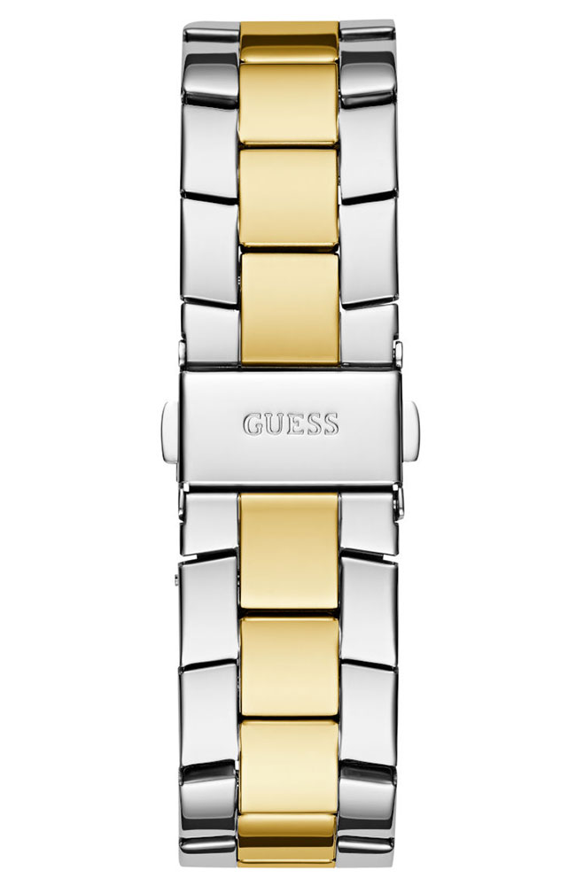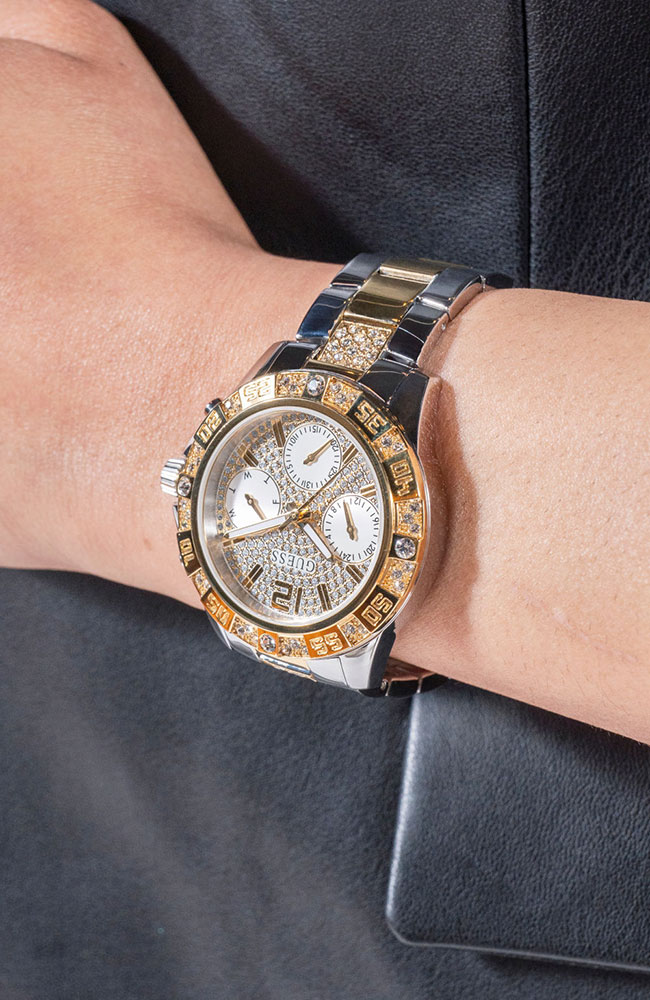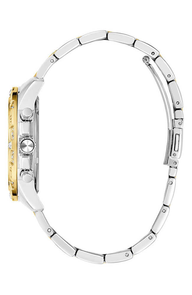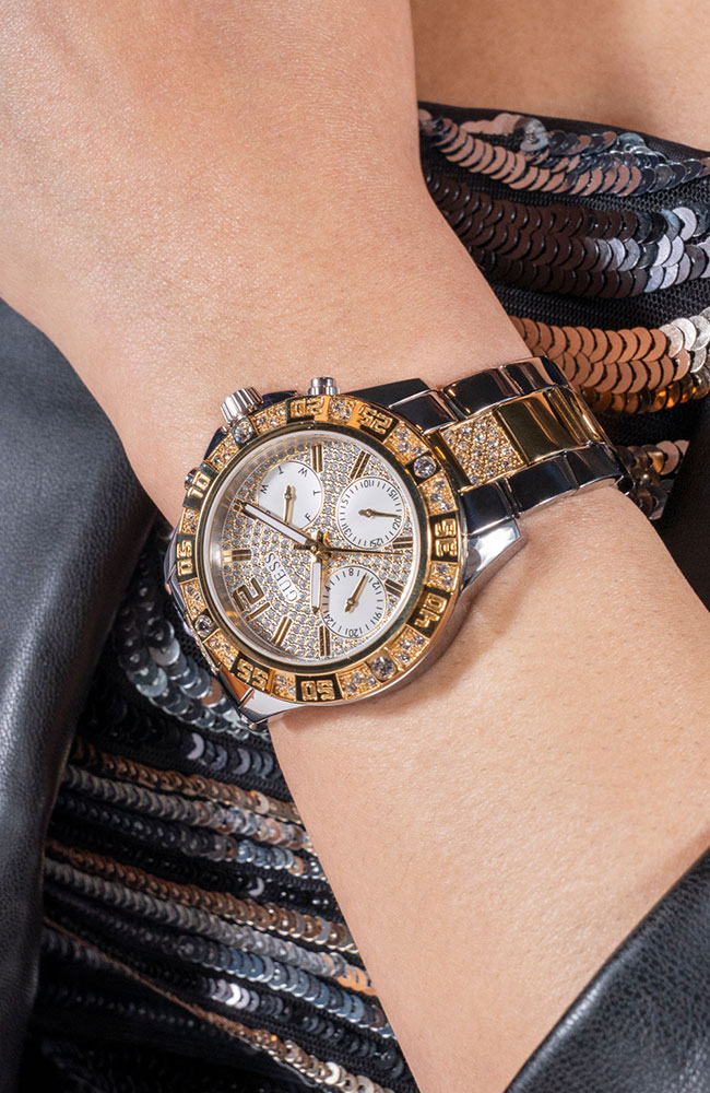 Γυναικείο ρολόι Guess από ανοξείδωτο ατσάλι με ασημί καντράν, πέτρες ζιργκόν και μπρασελέ.