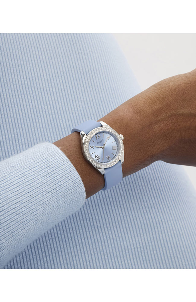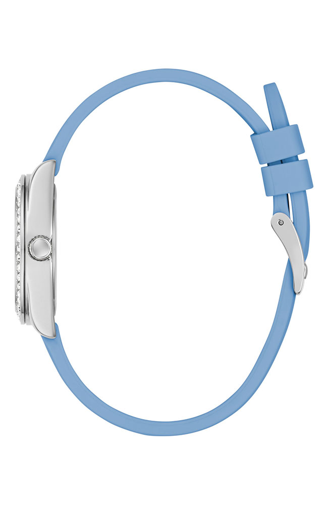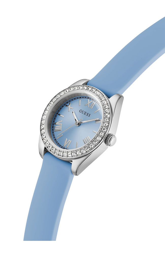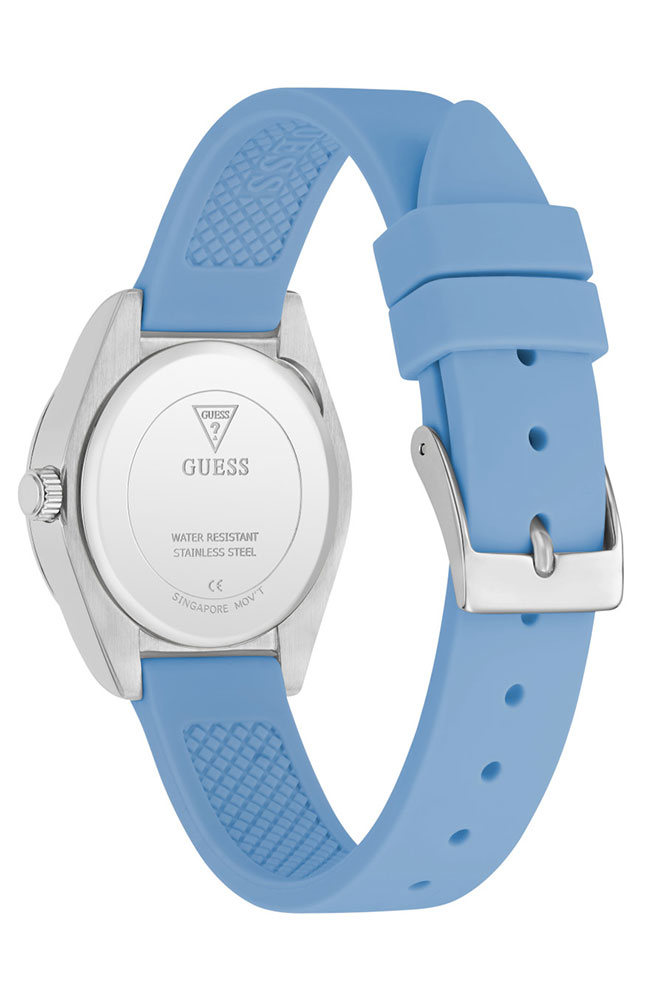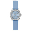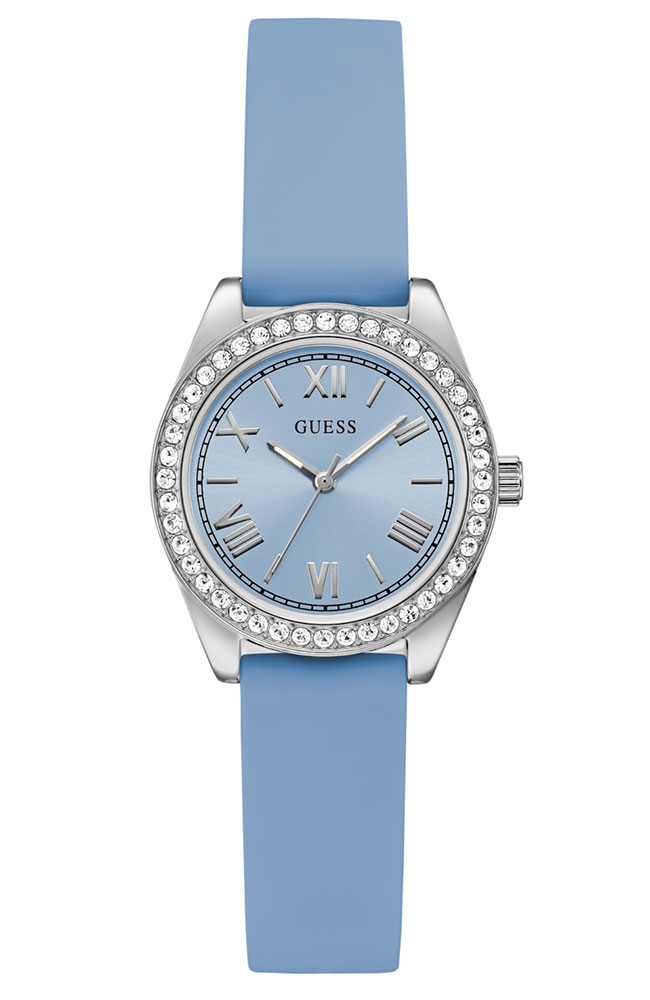 Γυναικείο ρολόι Guess από επιχρυσωμένο ανοξείδωτο ατσάλι με γαλάζιο καντράν και γαλάζιο δερμάτινο λουράκι.