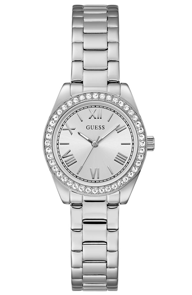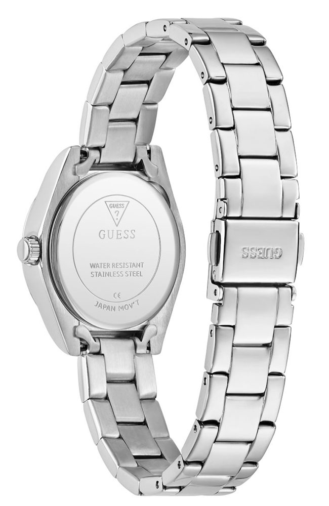 Γυναικείο ρολόι Guess από ανοξείδωτο ατσάλι με ασημί καντράν και μπρασελέ.