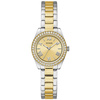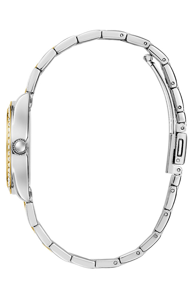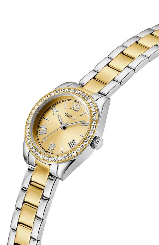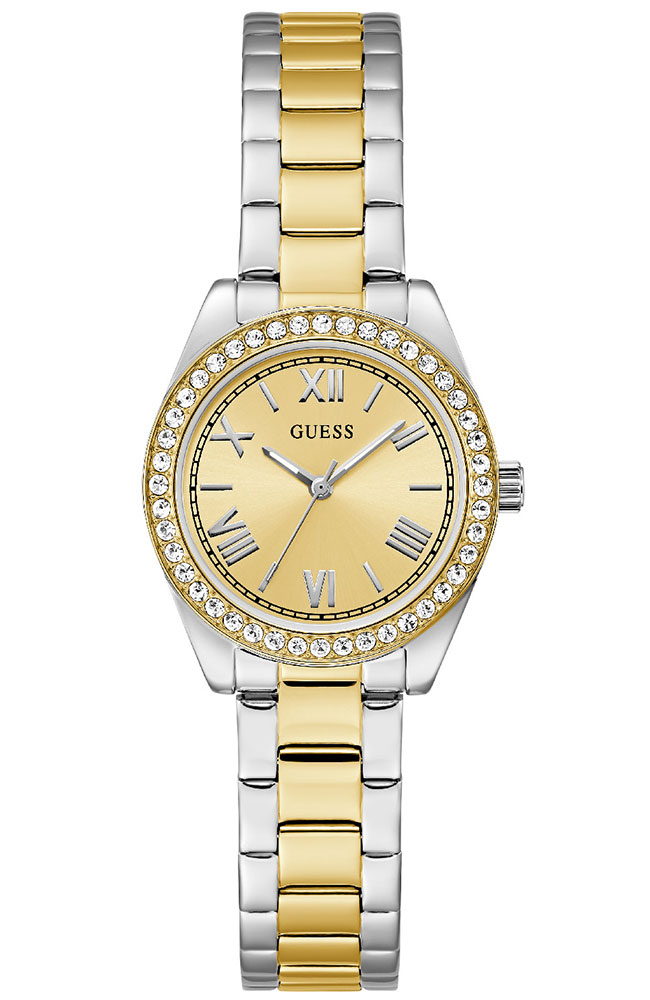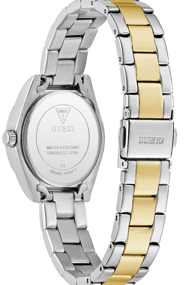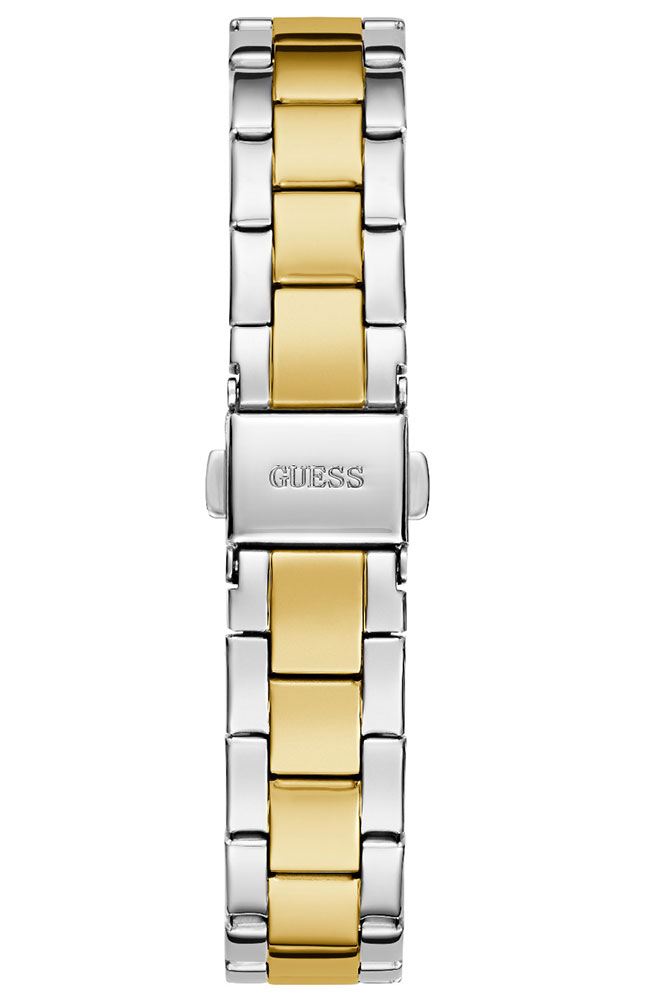 Γυναικείο ρολόι Guess από ανοξείδωτο ατσάλι με χρυσό καντράν και δίχρωμο μπρασελέ.