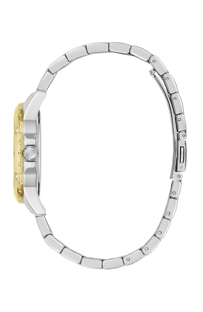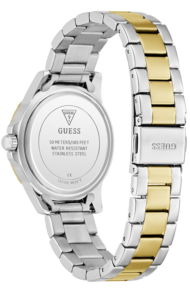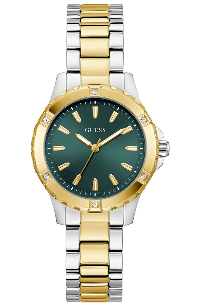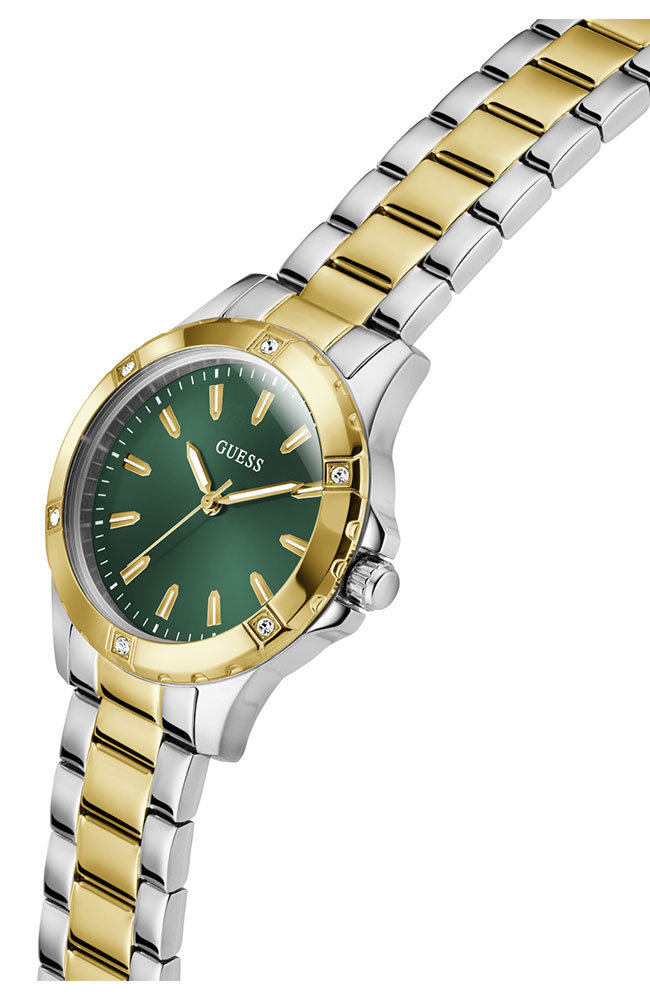 Γυναικείο ρολόι Guess από ανοξείδωτο ατσάλι με πράσινο καντράν, πέτρες ζιργκόν και μπρασελέ.