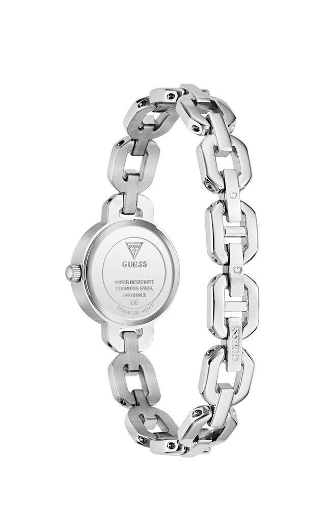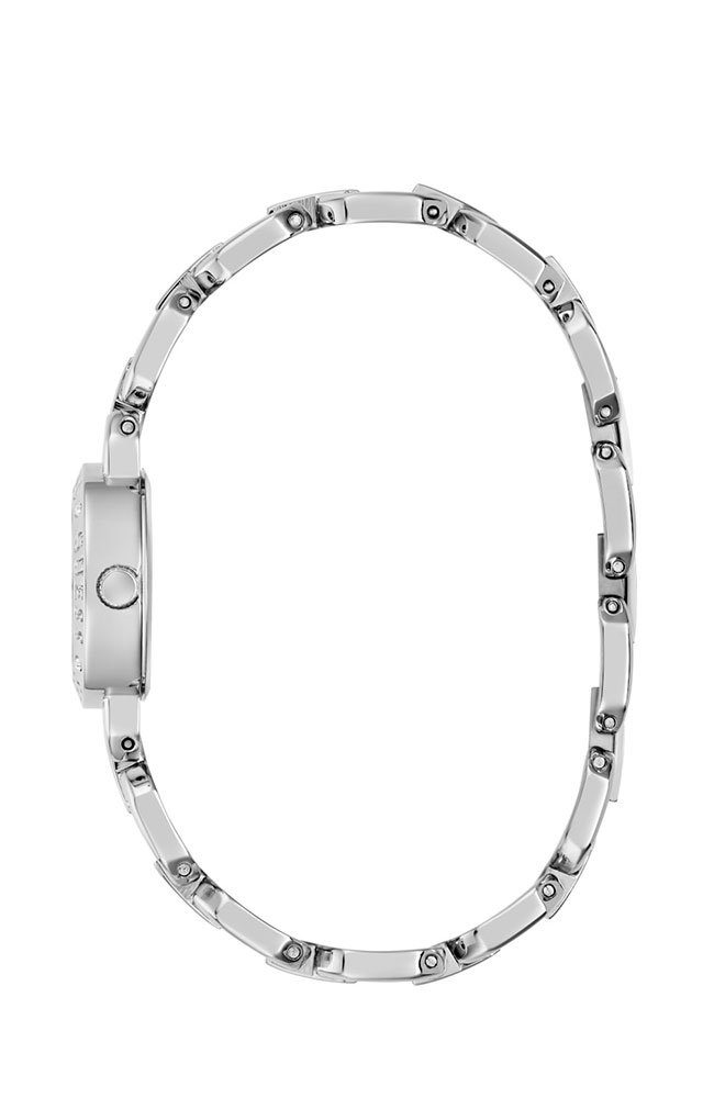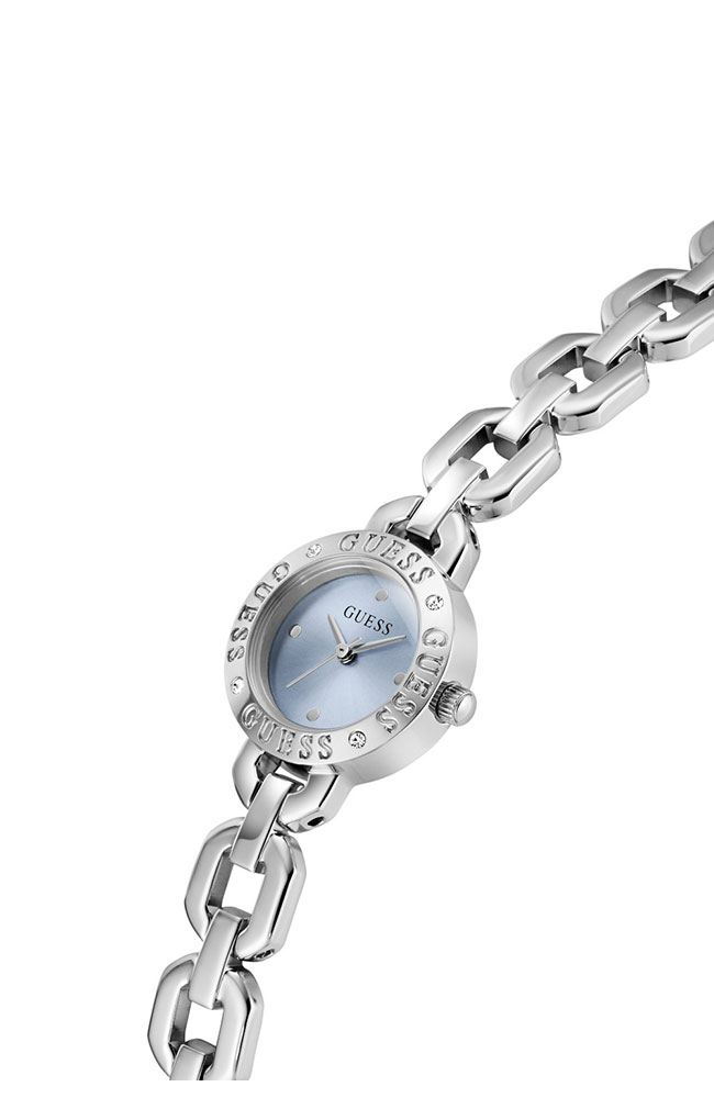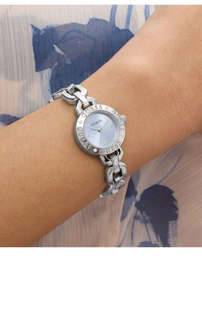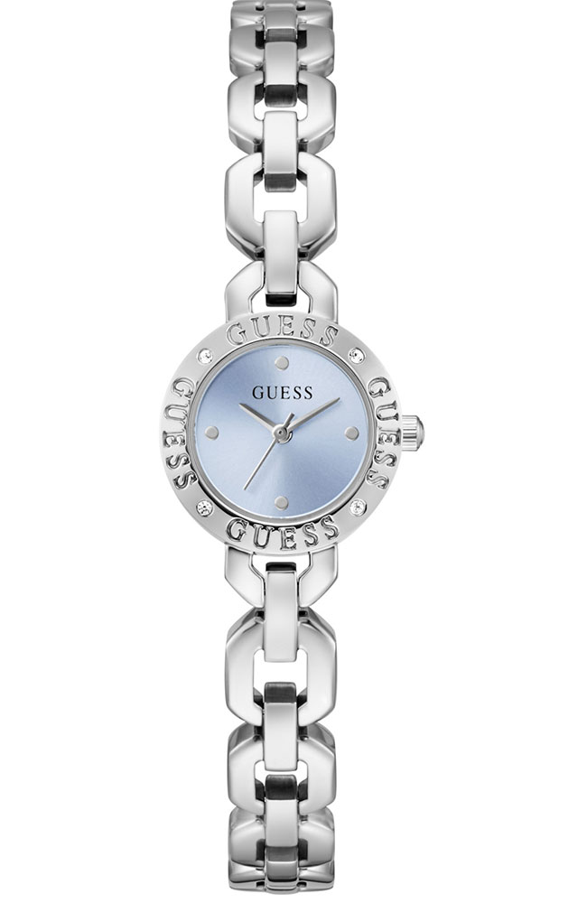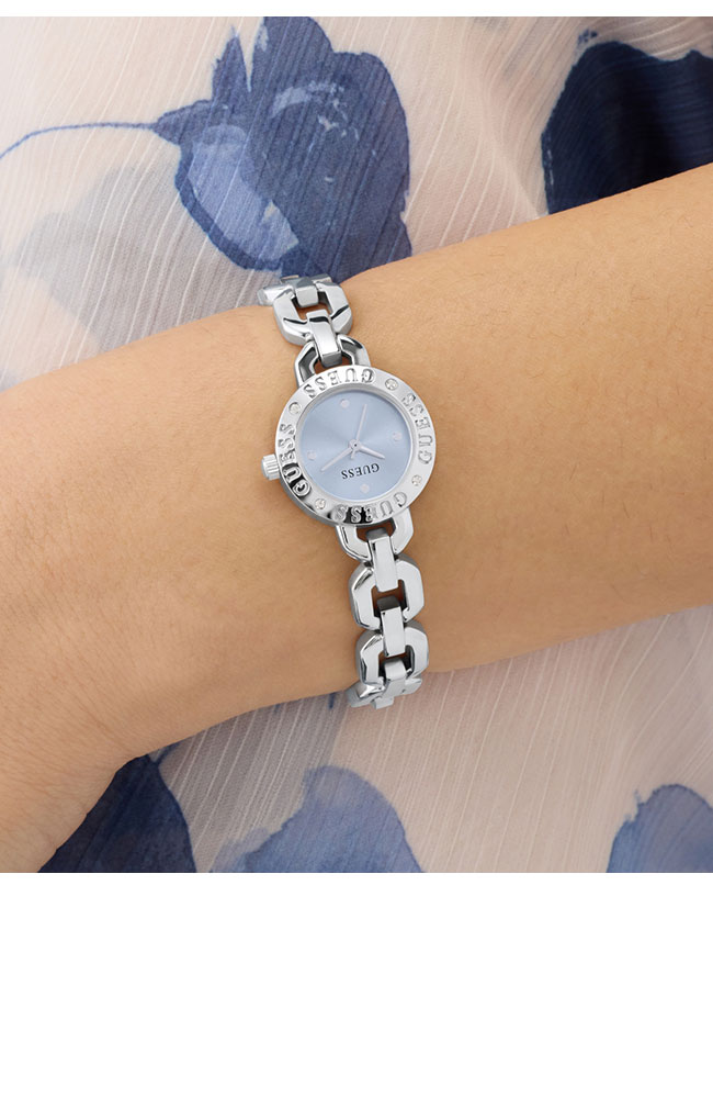 Γυναικείο ρολόι Guess από ανοξείδωτο ατσάλι με μπλε καντράν, πέτρες ζιργκόν και μπρασελέ.