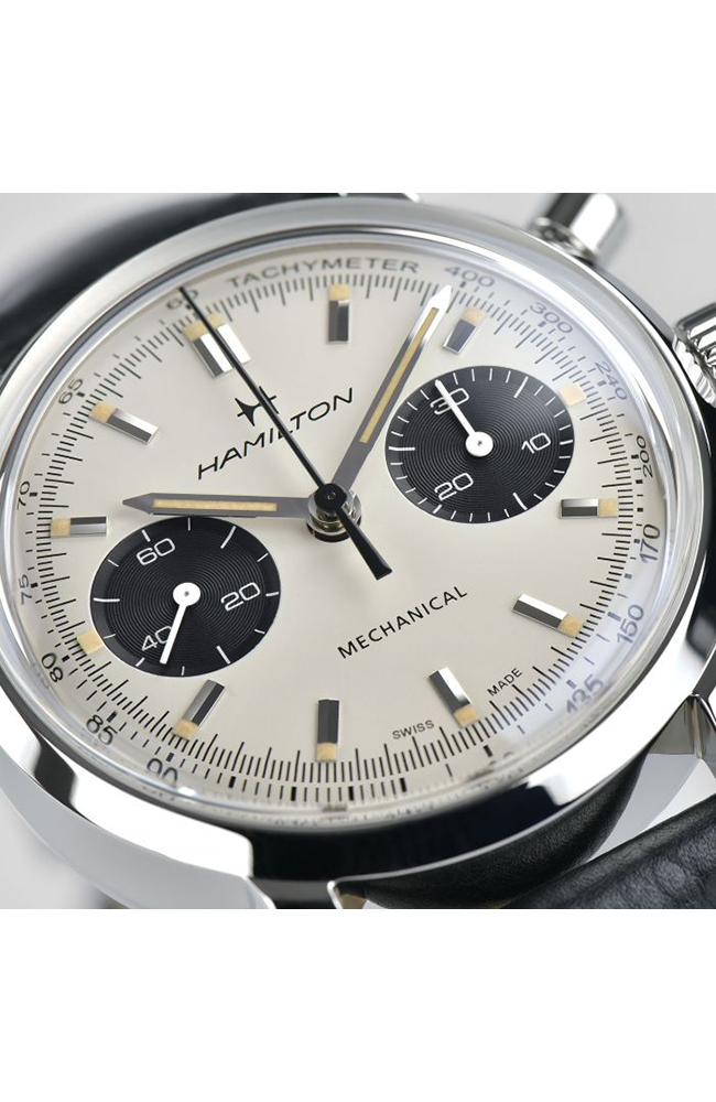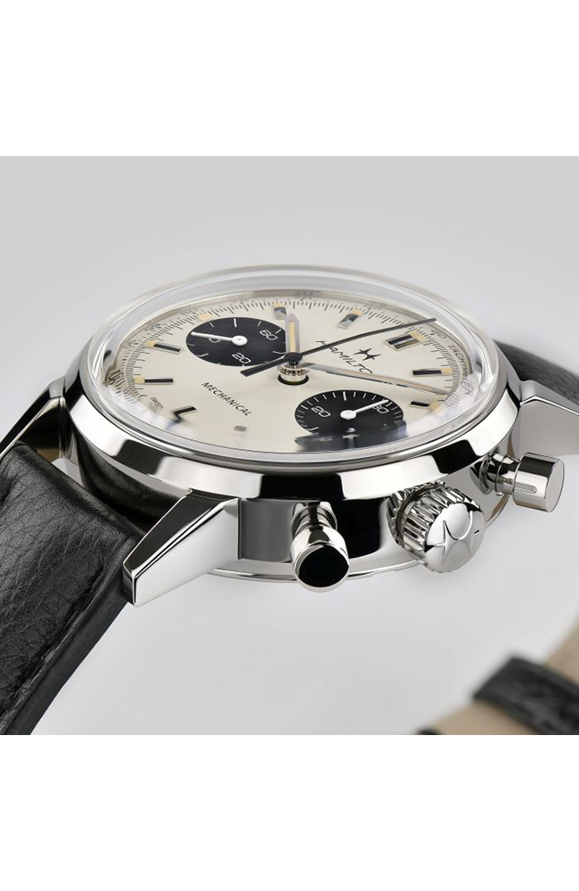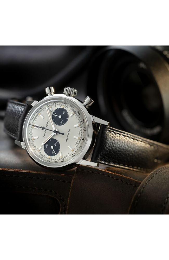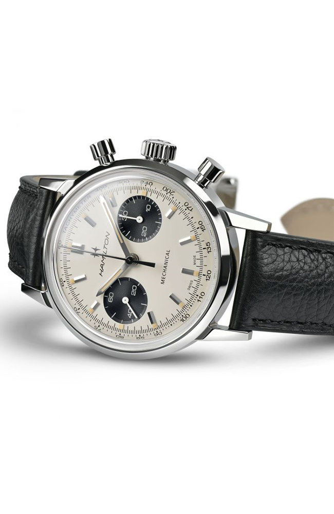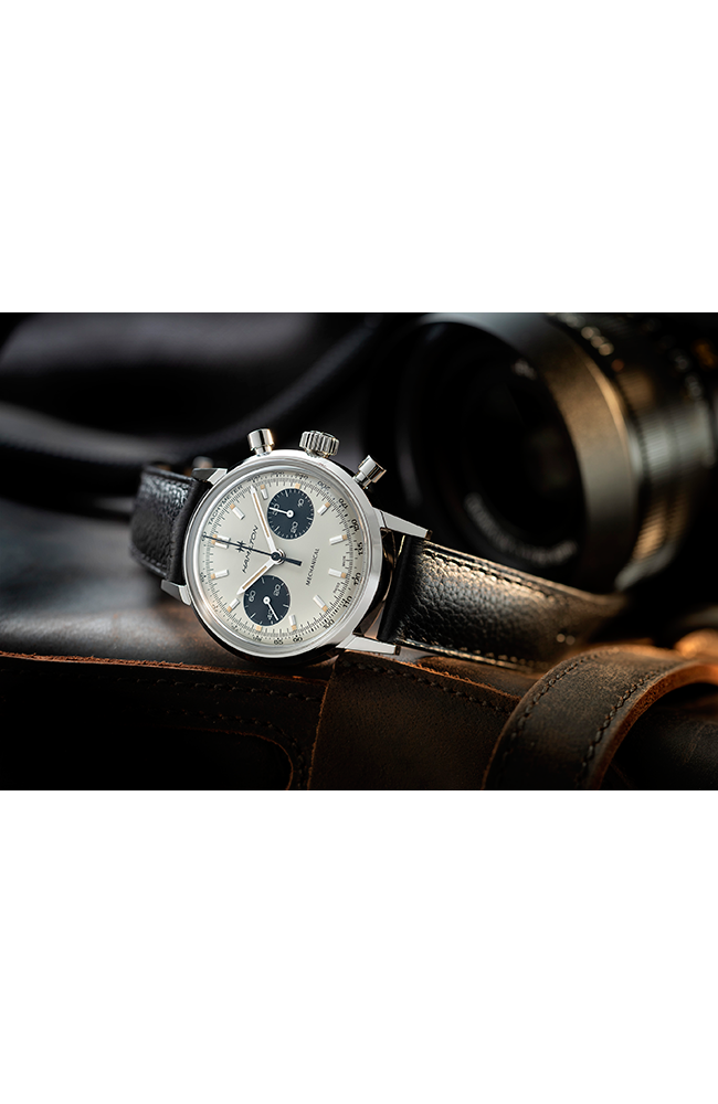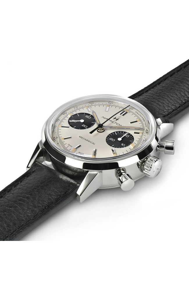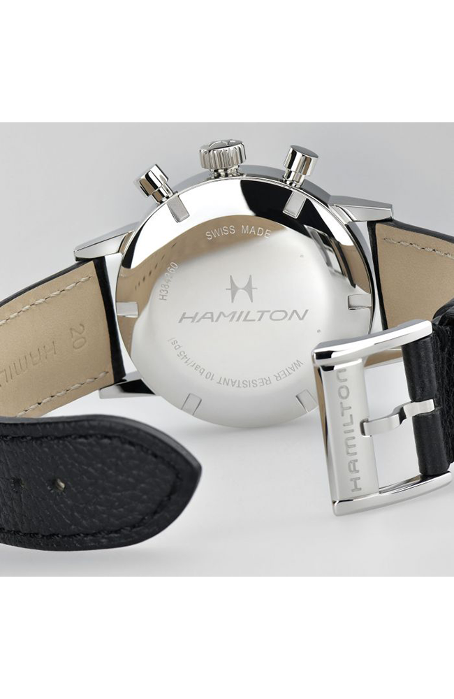 Ανδρικό ρολόι Μηχανικό Hamilton Ελβετικό, από ανοξείδωτο ατσάλι με δίχρωμο καντράν και μαύρο δερμάτινο λουράκι.
