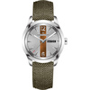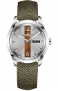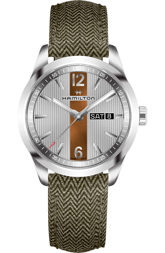 Ανδρικό ρολόι Hamilton ελβετικής κατασκευής από ανοξείδωτο ατσάλι με ασημί καντράν και χακί δερμάτινο λουράκι.