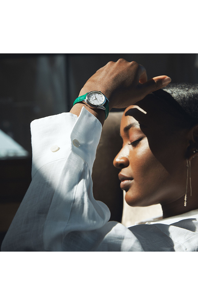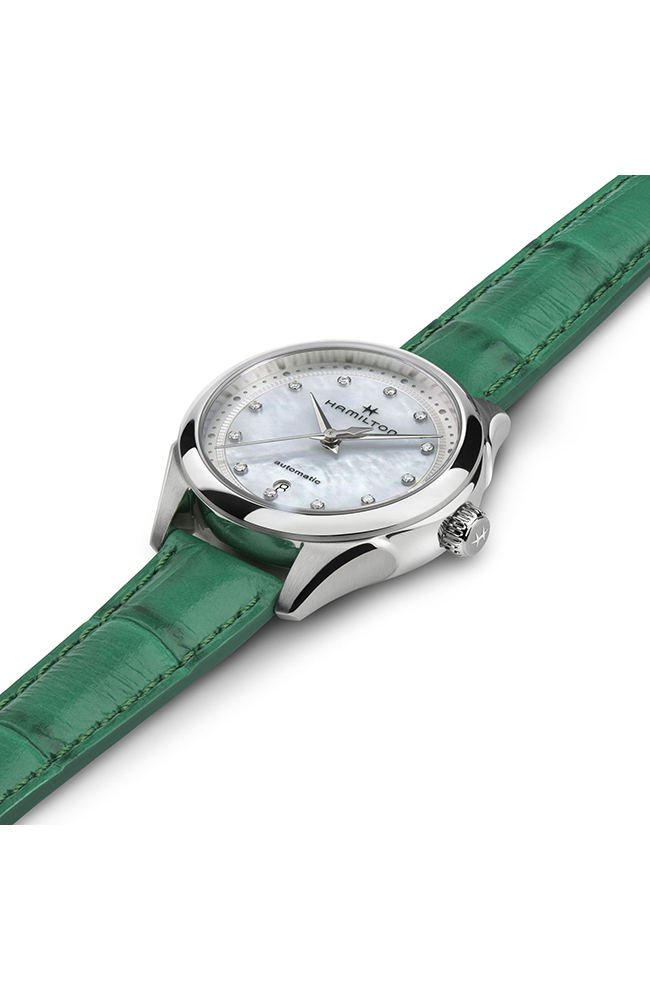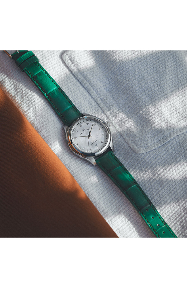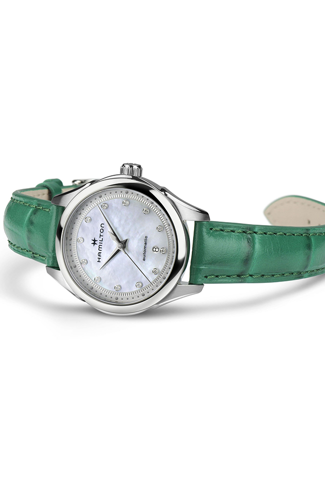Γυναικείο ρολόι Hamilton ελβετικής κατασκευής με αυτόματο μηχανισμό από ανοξείδωτο ατσάλι με λευκό φίλντισι καντράν, 12 διαμάντια και δερμάτινο λουράκι.